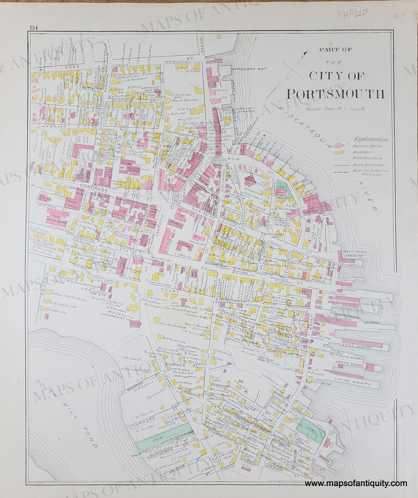 Antique hand-colored map of a portion of Portsmouth, New Hampshire. From the Town and City Atlas of the State of New Hampshire, by D.H. Hurd, 1892. Where the wharves are on this map is now Prescott Park. Includes the names of property owners at the time of publication. Original hand-coloring with pink indicating businesses, yellow indicating residences, and green for cemeteries. Very good antique condition with mild toning of the paper, and a couple spots of very minor foxing/soiling. Measures approx. 13 x 17.25 inches.