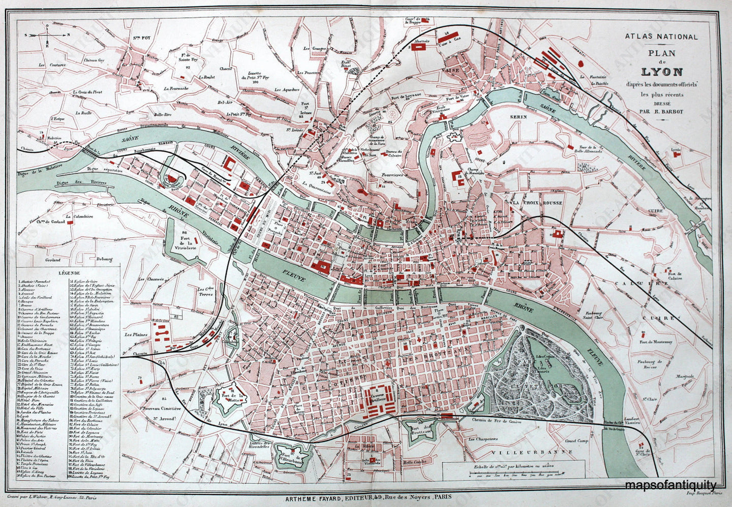 City of Lyon Map, Lyon, France, showing railroad information, key buildings and sites, parks, and streets, Very good overall antique condition, 10 1/2" h x 15 1/2"w.