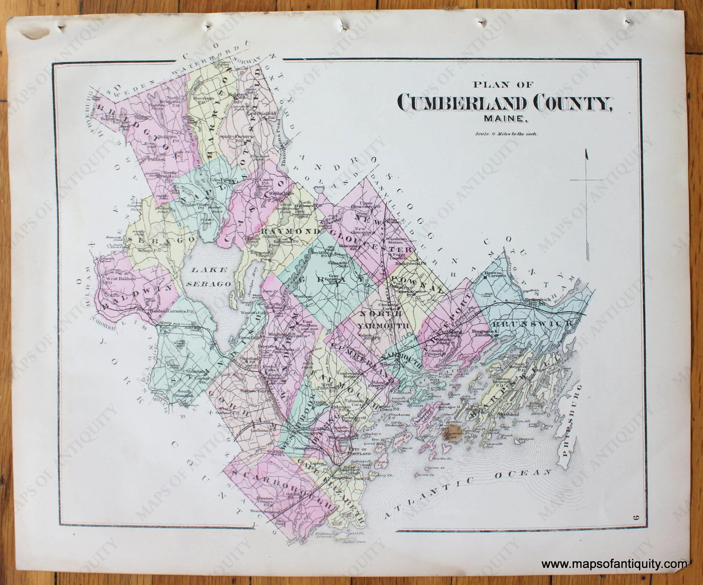 Antique hand colored map of Cumberland County Maine, published in the Atlas of Cumberland Co., Maine, by Beers, 1871. Map is colored by town and includes railroads, etc. Fair to good overall antique condition with mild toning throughout, some water staining (mainly outside the neatline, with some going beyond,) and one spot of noticeable foxing within the map. Measures approximately 10.75" x 13.25" (H x W) to the neatline. *Note: Priced As Is.