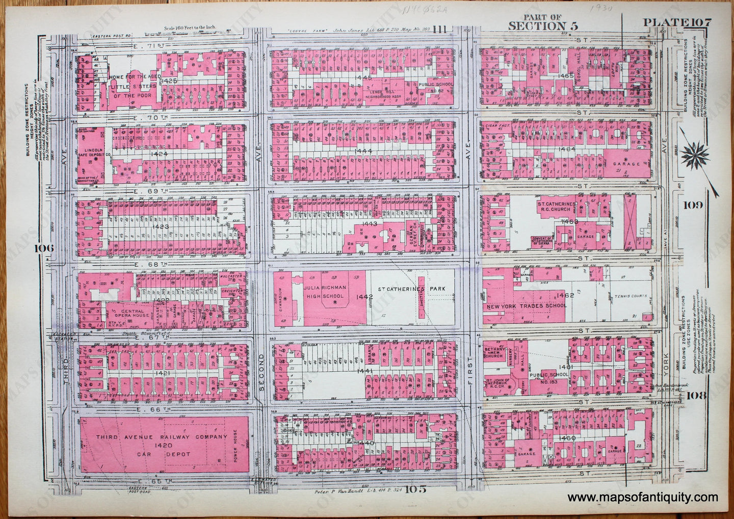 Antique printed color map of part of Manhattan, New York City, from the Atlas of New York City by Bromley, 1930. Shows E 65th to E 71st and Third Ave to York Ave. The explanation key for this atlas was only included on the index map- pink indicates brick, yellow is frame (wood), an X means the building is a stable, the numbers and letters on each building indicate the number of stories of the building and whether it has a basement, store, or saloon (see index image for full explanation). Very good antique condition with toning overall. Sheet measures approx. 11.5 x 16.25 inches. Double-sided sheet has NYC062A on one side and NYC062B on the other side (please add only one of these two maps to your cart).