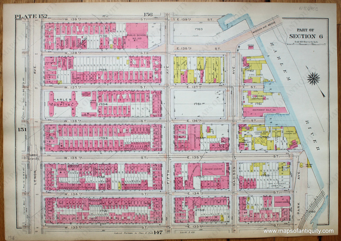 Antique printed color map of part of Manhattan, New York City, from the Atlas of New York City, Borough of Manhattan, by Bromley, 1916. Shows W 133rd and E 133rd to W 139th and E 133rd and Lenox Ave to Park Ave with the Harlem River and Harlem Hospital. The explanation key for this atlas was only included on the index map- pink indicates brick, yellow is frame (wood), an X means the building is a stable, the numbers and letters on each building indicate the number of stories of the building and whether it has a basement, store, or saloon (see index image for full explanation). Very good antique condition with toning overall. Sheet measures approx. 11.5 x 16.25 inches. Double-sided sheet has NYC095A on one side and NYC095B on the other side (please add only one of these two maps to your cart).