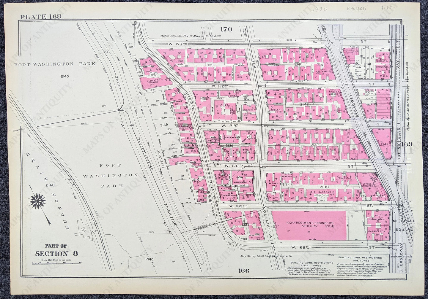 Antique printed color map of part of Manhattan, New York City, from the Atlas of New York City, Borough of Manhattan, by Bromley, 1930. Shows W 168th to W 173rd and Fort Washington Park to Broadway and St Nicholas Ave. The explanation key for this atlas was only included on the index map- pink indicates brick, yellow is frame (wood), an X means the building is a stable, the numbers and letters on each building indicate the number of stories of the building and whether it has a basement, store, or saloon (see index image for full explanation). Very good antique condition with toning overall. Sheet measures approx. 11.5 x 16.25 inches. Double-sided sheet has NYC110A on one side and NYC110B on the other side (please add only one of these two maps to your cart).