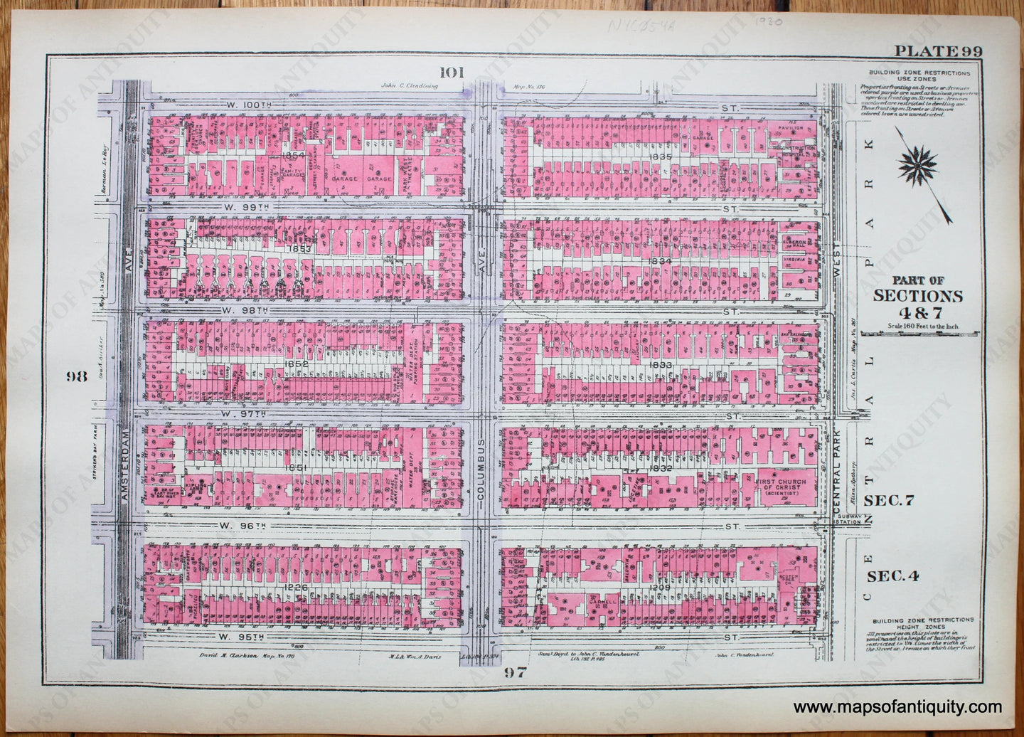 Antique printed color map of part of Manhattan, New York City, from the Atlas of New York City by Bromley, 1930. Shows W 95th to W 100th and Amsterdam Ave to Central Park West. The explanation key for this atlas was only included on the index map- pink indicates brick, yellow is frame (wood), an X means the building is a stable, the numbers and letters on each building indicate the number of stories of the building and whether it has a basement, store, or saloon (see index image for full explanation). Very good antique condition with toning overall. Sheet measures approx. 11.5 x 16.25 inches. Double-sided sheet has NYC054A on one side and NYC054B on the other side (please add only one of these two maps to your cart).