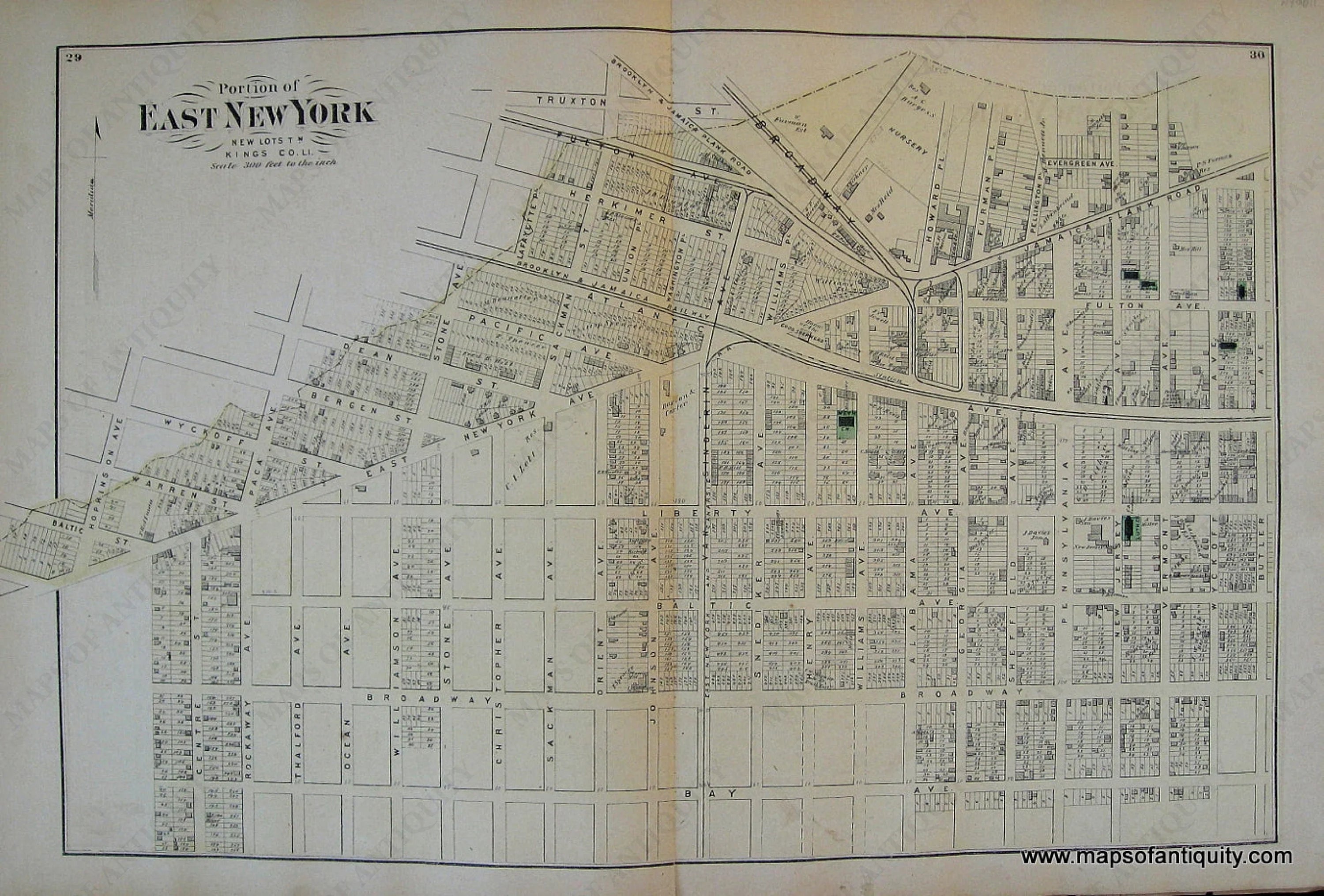 Antique page of maps from the Atlas of Long Island, New York, by Beers, Comstock & Cline, 1873. Centerfold map is a Portion of East New York near Broadway Junction. Back sides are Fort Hamilton on one side and Gravesend on the other side. All parts of Brooklyn NY. These maps show businesses, churches, roads, railroads, parks, property owners. Original hand-coloring. Good to very good  antique condition, some toning. Measures approx. 14 x 22 inches (centerfold, to the neatline) and 10.75 x 14 inches on verso maps.
