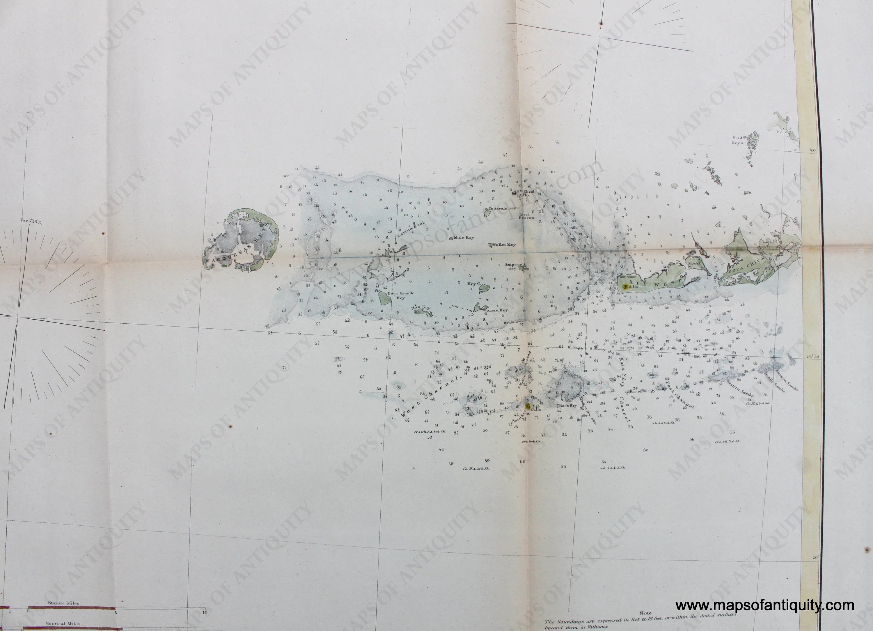 Antique hand colored coast survey chart of part of the Florida Keys, including Key West the Tortugas Keys, Marquesas Keys, and Boca Chica, 16.5"h x 26.75"w, Very good overall antique condition with some minor spots, some light toning along the folds, and slight wear along the folds.