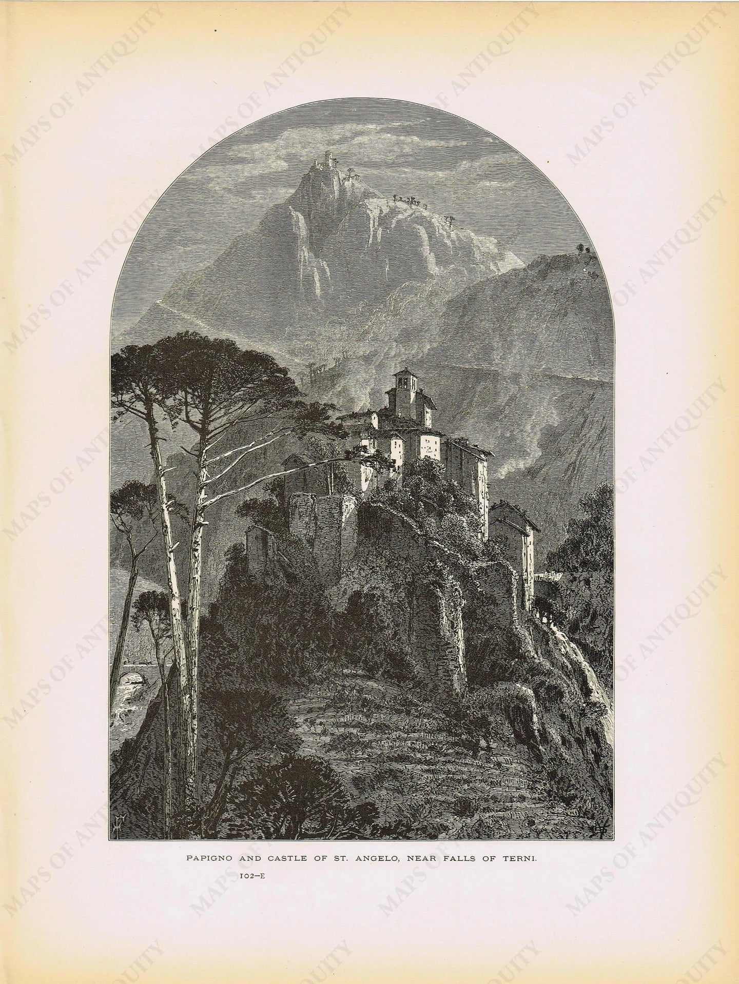 Antique woodcut engraving print published in Picturesque Europe, copied from a painting by Harry Fenn, View of Castle on a hill with mountains in background, Papigno Italy. Very good condition with minimal signs of age as pictured. Measures approximately 11" x 8" to just outside the printed image including text.