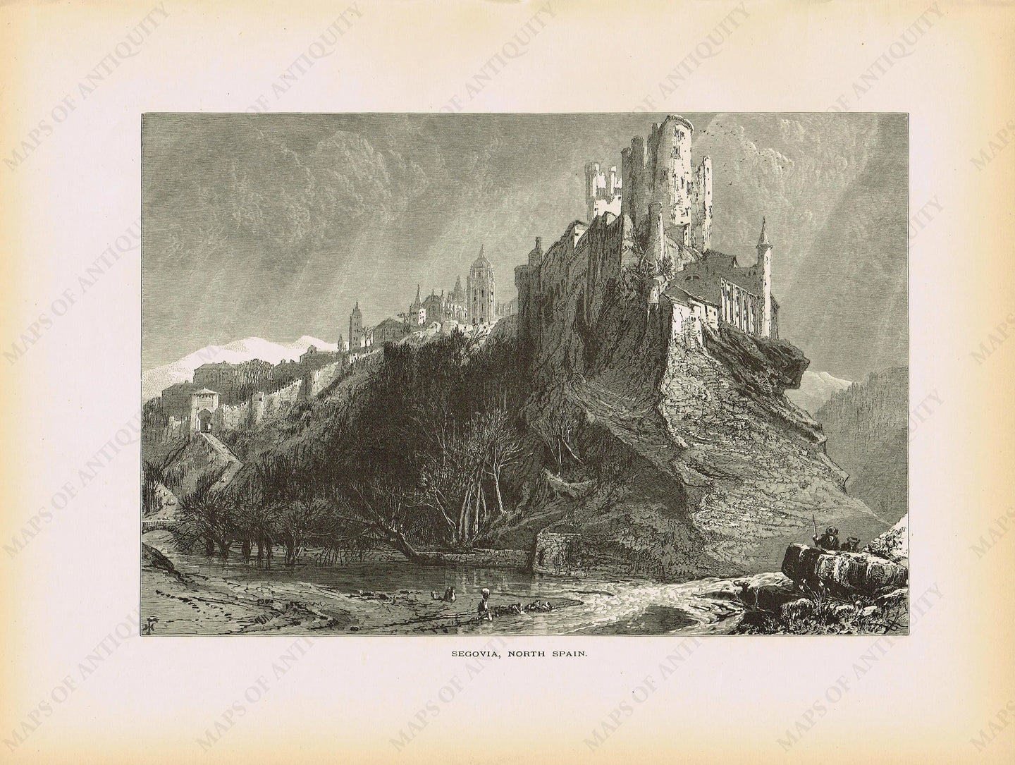 Antique woodcut engraving print published in Picturesque Europe, copied from a painting by Harry Fenn, View of a castle overlooking a cliff with figures in foreground. Very good condition with minimal signs of age as pictured. Measures approximately 8" x 11" to just outside the printed image including text.