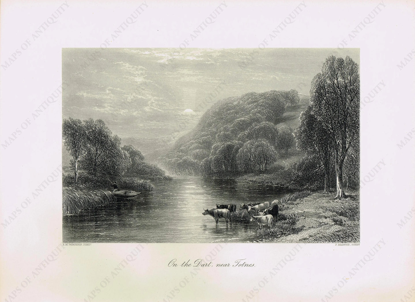 Antique steel engraving print published in Picturesque Europe by E. M. Wimperis Bucolioc scene of cattle in the River Dart near Totnes. Excellent condition with minimal signs of age as pictured. Measures approximately 8" x 11" to just outside the printed image including text.