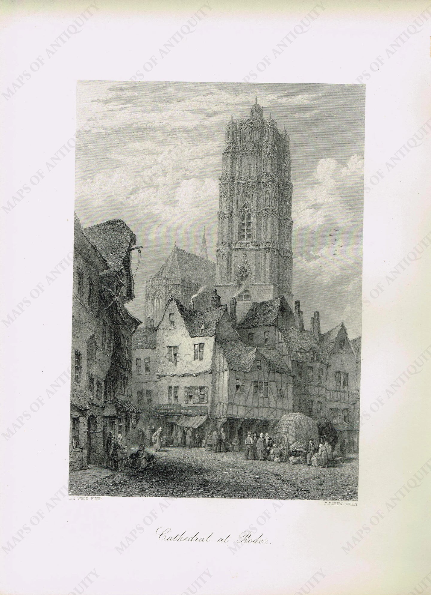 Antique steel engraving print published in Picturesque Europe by L. J. Wood, View of the Cathedral at Rodez with Medieval style house in foreground. Excellent condition with minimal signs of age as pictured. Measures approximately 8" x 11" to just outside the printed image including text.