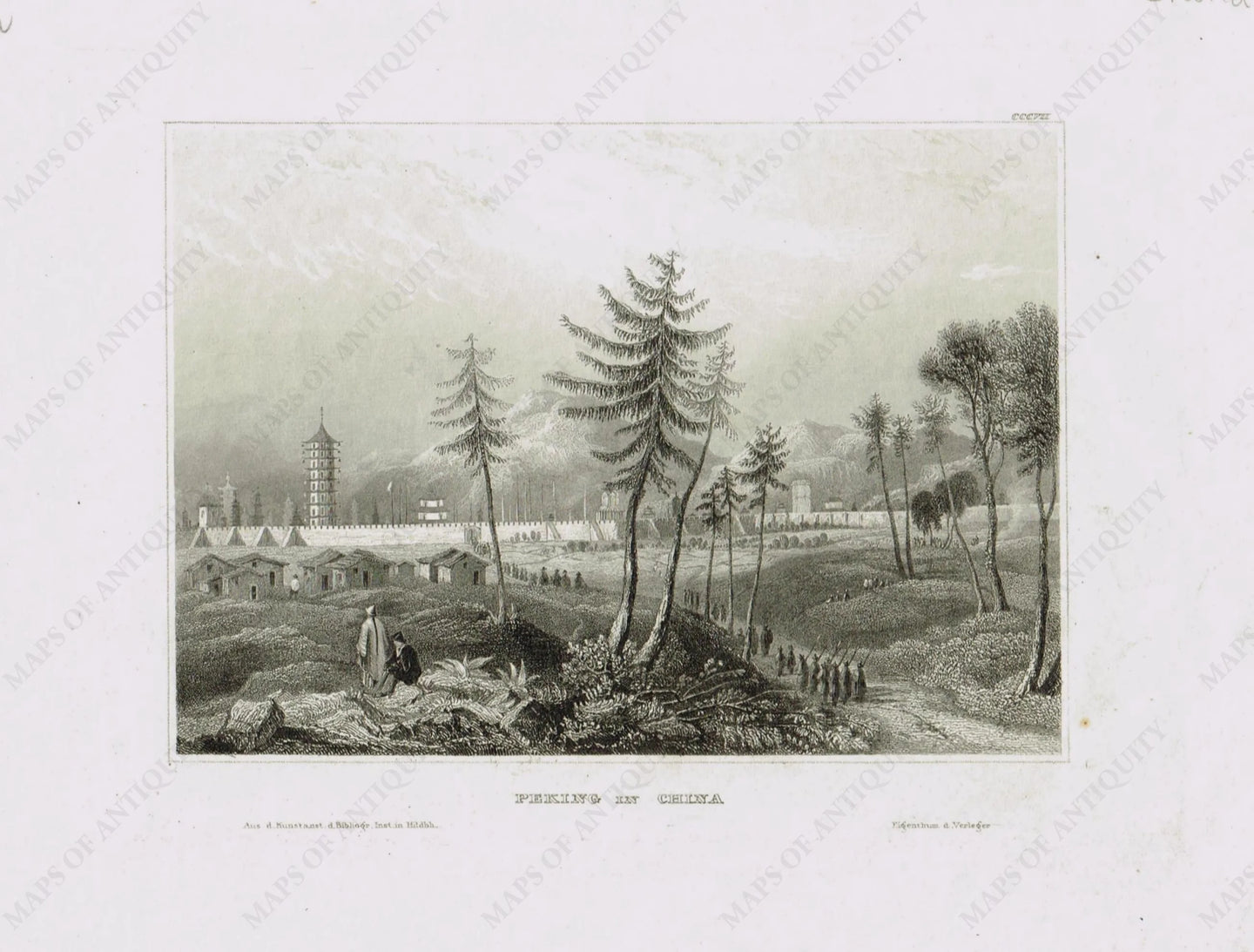 Antique black & white engraving print, shows a view of figures marching in column towards the walled city of Beijing with a pagoda in the distance. Good condition, approximately 7" x 10" to the paper edges