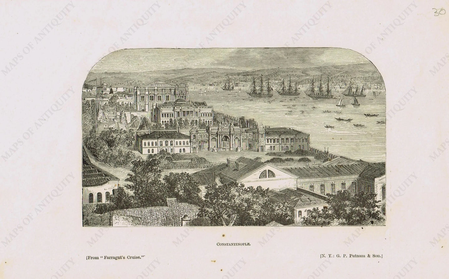 Antique black & white engraving print. Shows a view of the city of Istanbul overlooking ships anchored in the Bosporus Straight, Turkey. Good condition, approximately 6" x 9.5" to the paper edges