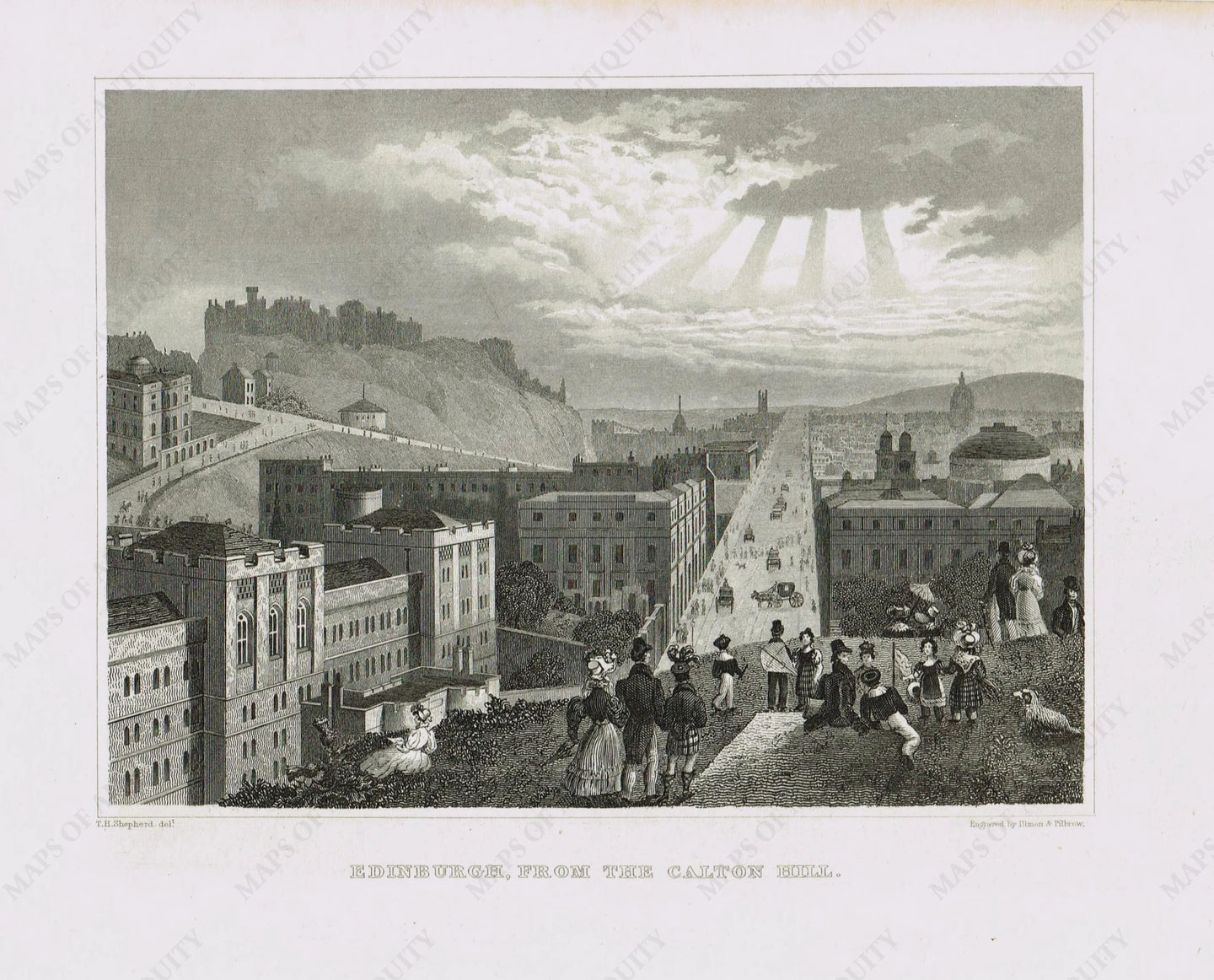 Antique black & white engraving print. Shows a view of the city of Edinburgh from an elevated height on the Calton hill with figures in foreground and sunray breaking through sclouds in distance. Good condition, approximately 8.5" x 10.5" to the paper edges
