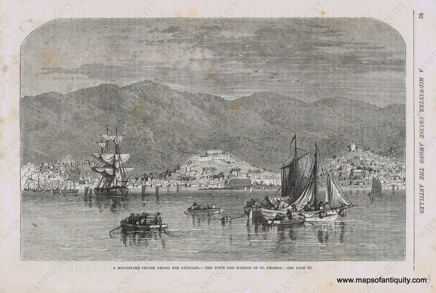 Antique black & white engraving print. Shows a view of a ships anchored off the coast of Saint Thomas, an island in the Caribbean with buildings visible in the distance and fishing boats in foreground. Good condition, approximately 7.5" x 11" to the paper edges.