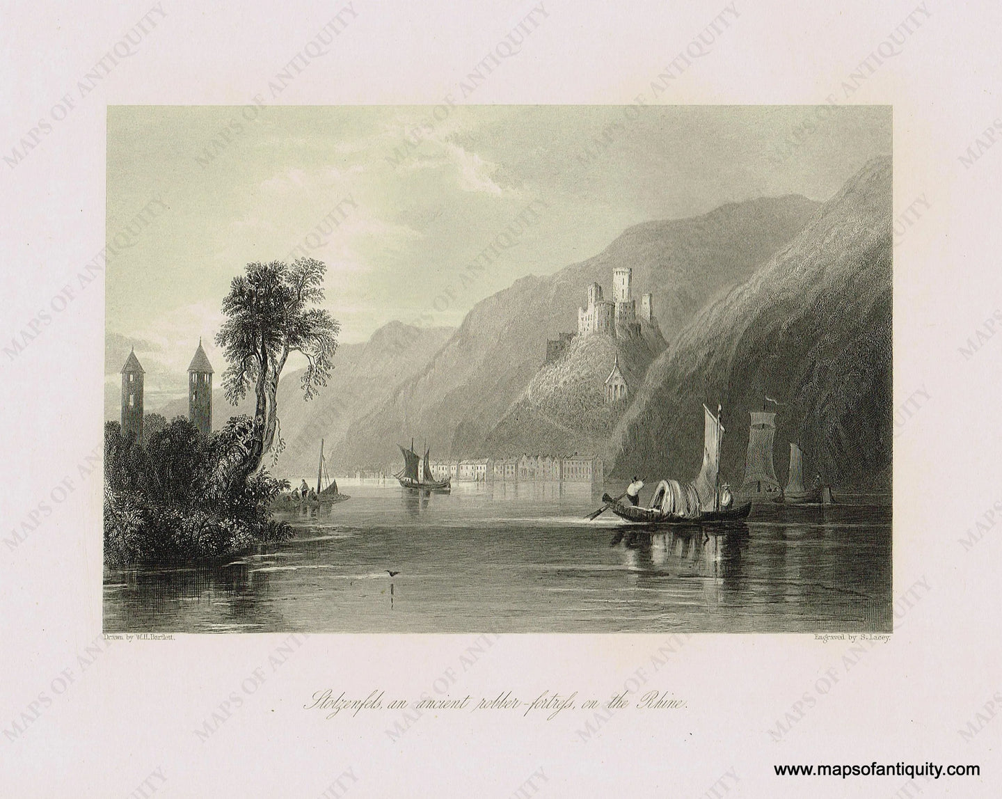 Antique black & white engraving print. Shows a view of the Stolzenfels Castle overlooking boats on the Rhein (Rhine) River, towers in foreground. Good condition, approximately 9" x 12" to the paper edges