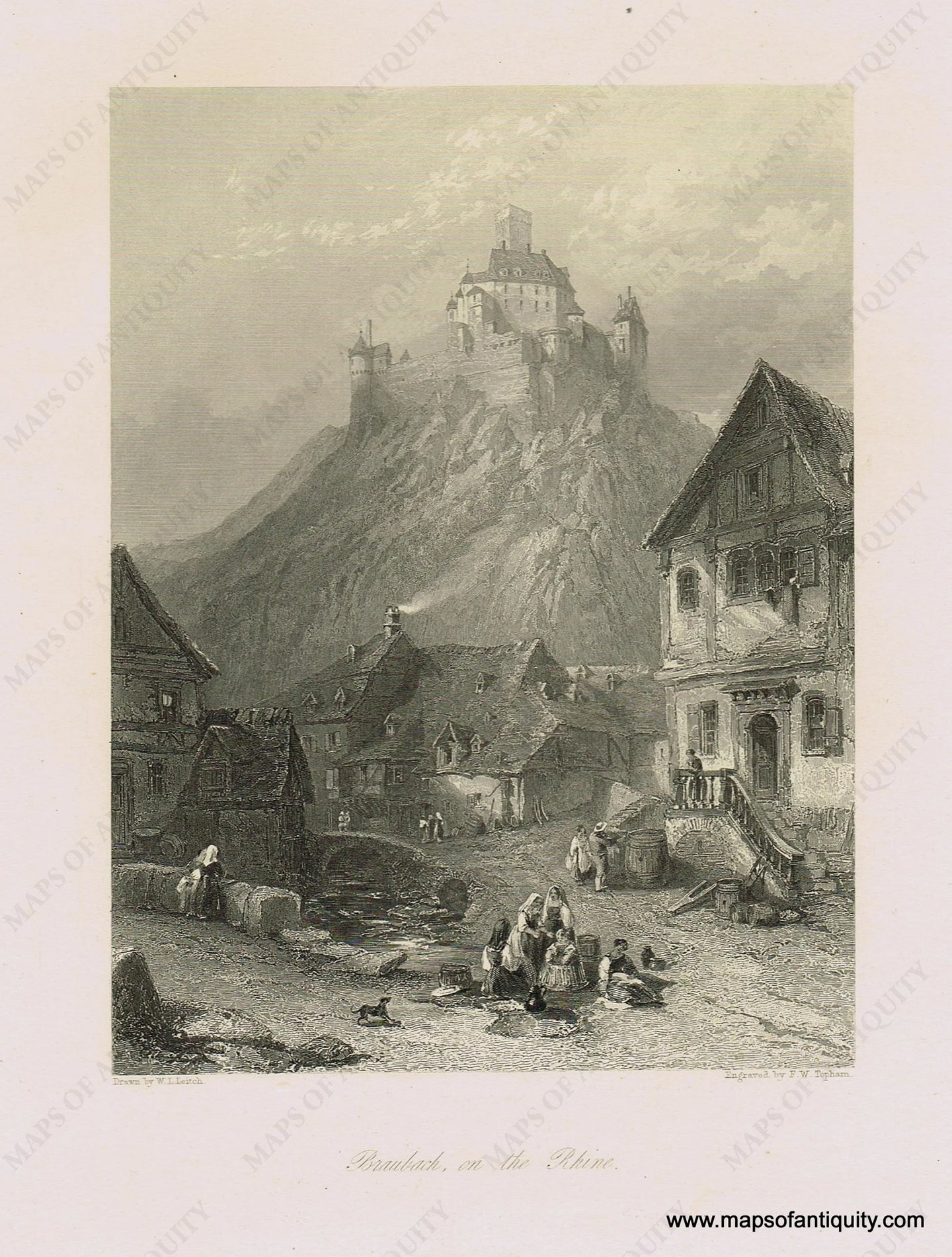 Antique black & white engraving print. Shows a view of Marksburg Castle on a hill overlooking medieval style houses on the streets of Braubach with figures in foreground, Germany. Good condition, approximately 9" x 12" to the paper edges