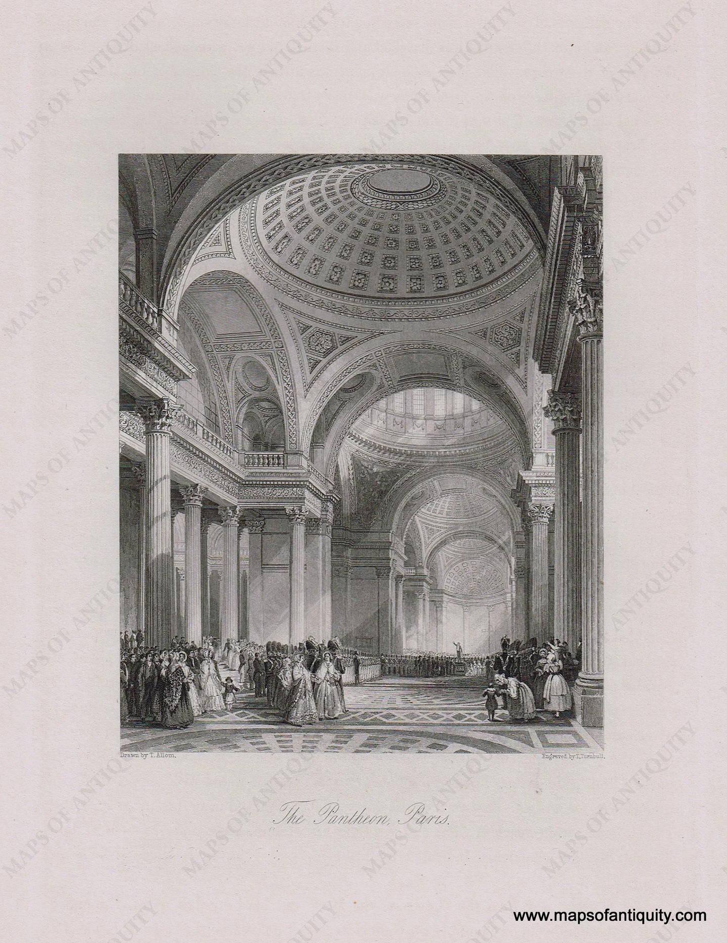 Antique black & white engraving print. Shows a view of soldiers and spectators gathered to watch an orator in the Panthéon, Latin Quarter, Paris. The elaborate structure was originally comissioned by Louis XV to be a church, however by the time of its completion the French Revolution had begun and the building was chosen to be a Mausoleum for prominent French figures. Good condition, approximately 12" x 9" to the paper edges