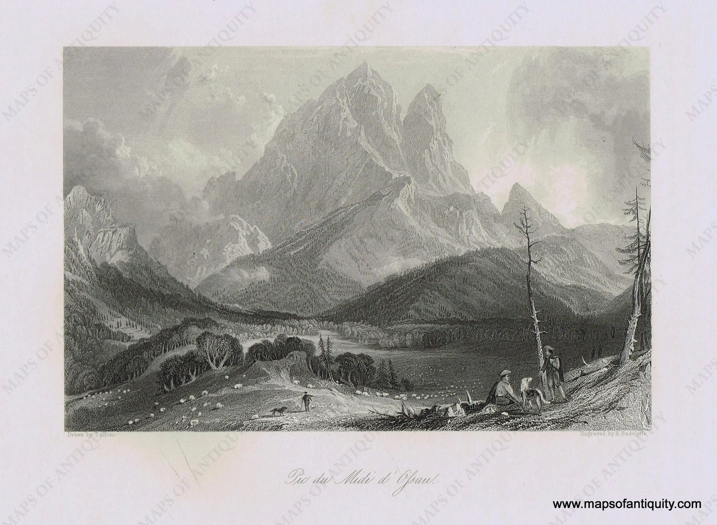 Antique black & white engraving print from "Europe Illustrated: its Picturesque Scenes and Places of Note" published by The London Printing and Publishing Company, 1875.. Shows a view of the Pic du Midi d'Ossau mountain in the Ossau Valley of the Pyrenees overlooking the Gave de Bious. Good condition, approximately 9" x 12.5" to the paper edges