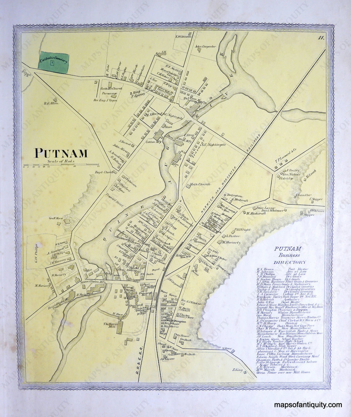 Antique map of Putnam CT (Connecticut) from the Atlas of Windham and Tolland Counties Conn., published by Keeney, 1869.