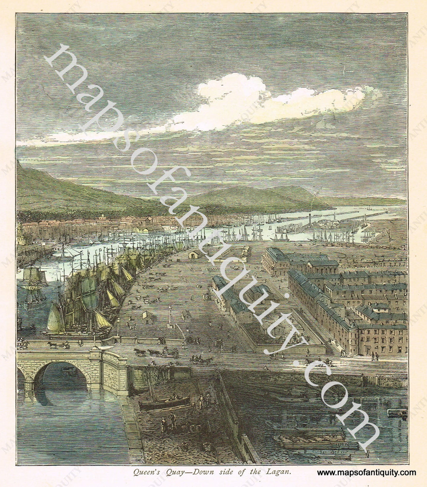 Hand colored antique print showing a view of Queen's Quay (Belfast, Ireland), down side of the River Lagan. Recent hand coloring. Image is in very good condition, with some mild toning of the paper. From John Savage's work, Picturesque Ireland, 1884. Image measure approximately 7" x 6".