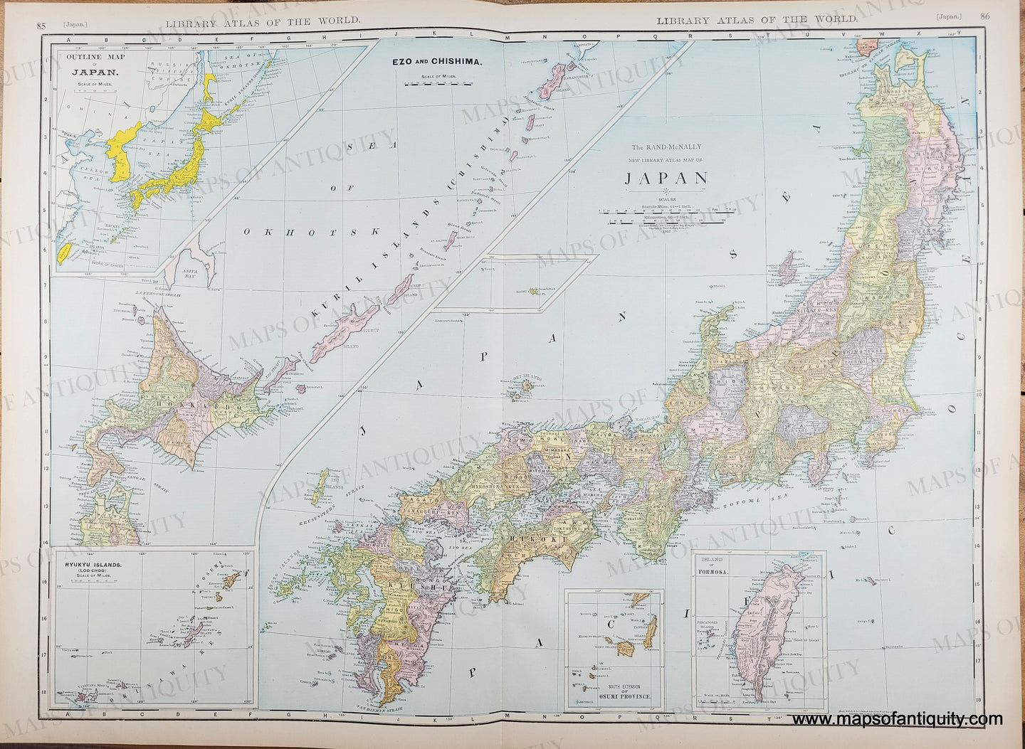Antique map of Japan by Rand McNally from 1912, showing details of provinces, land features and water bodies, cities and towns, with insets of South Extension of Osumi Province, Ryukyu Islands, Ezo and Chishima, Outline Map of Japan, and the Island of Formosa (Taiwan). At this time Japan claimed Korea and Taiwan. Japan controlled Taiwan from 1895 to 1945, following their victory in the First Sino-Japanese War and the subsequent Treaty of Shimonoseki. The Japanese control of Korea lasted from 22 August 1910 until 15 August 1945. Original printed color. Very good overall antique condition, 19.25 x 26 inches to the neatline.
