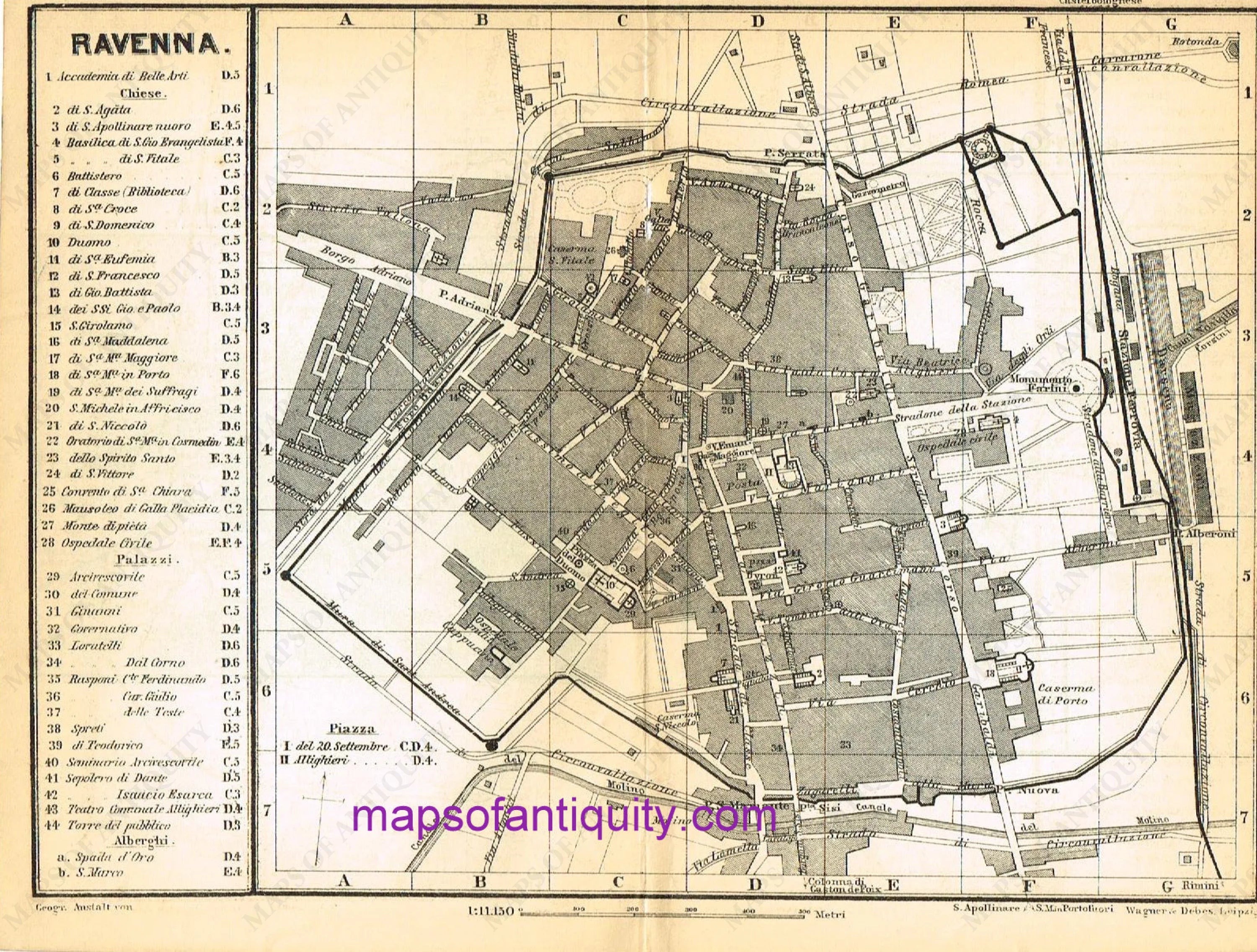 Antique Printed Black and White map of Ravenna, Italy, from Baedeker's "Italy. Handbook for Travelers", 1886. Includes key to points of interest; verso displays centers of Ravenna and Bologna. Very good condition, measures, approx. 5.75 x 8 inches.