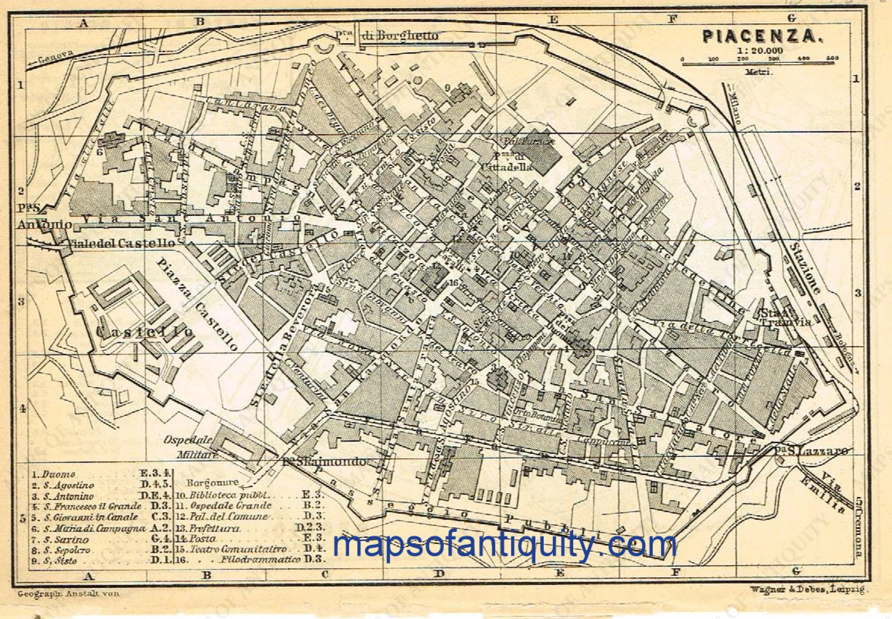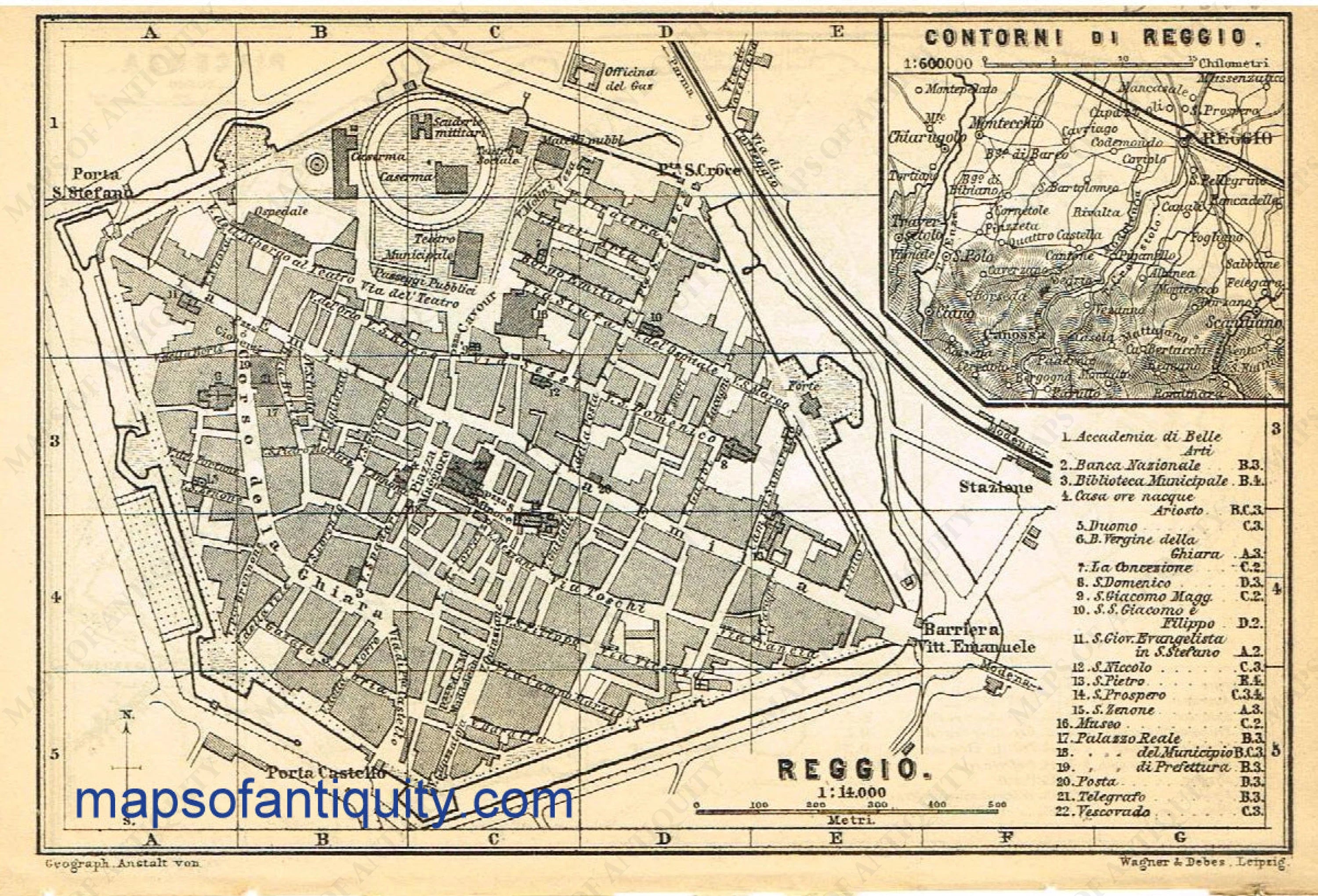 Antique Printed Black and White map of Reggio, Italy, from Baedeker's "Italy. Handbook for Travelers", 1886. Includes key to points of interest; verso displays map of Piacenza. Very good condition, measures, approx. 4 x 6 inches.