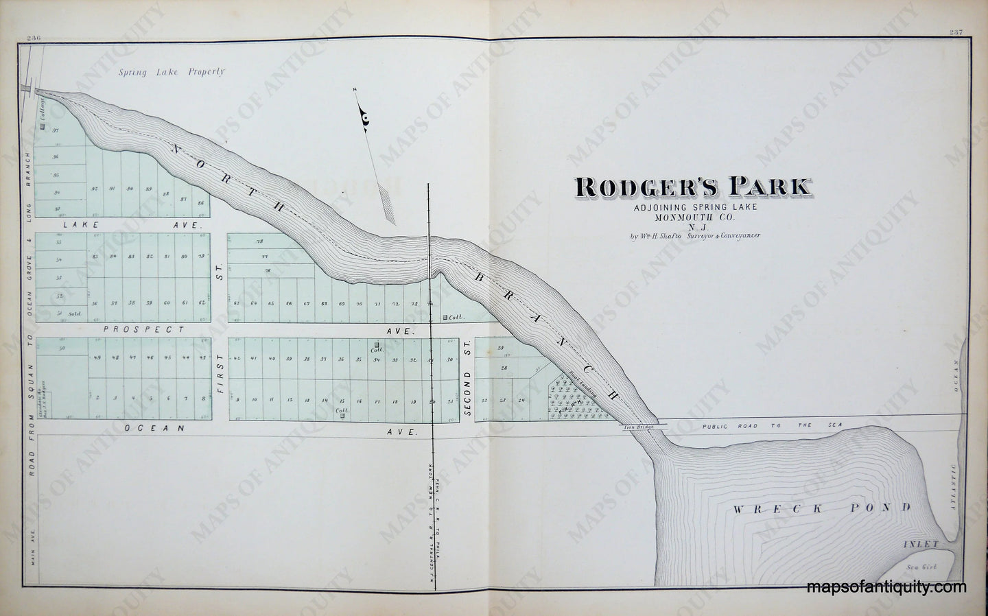 New Jersey Coast Atlas hand colored Rodger's Park adjoining Spring Lake, Monmouth County, N.J., showing new subdivision of properties of Rodger's Park adjoining Spring Lake, approximately 12" x 21", Very good overall antique condition.