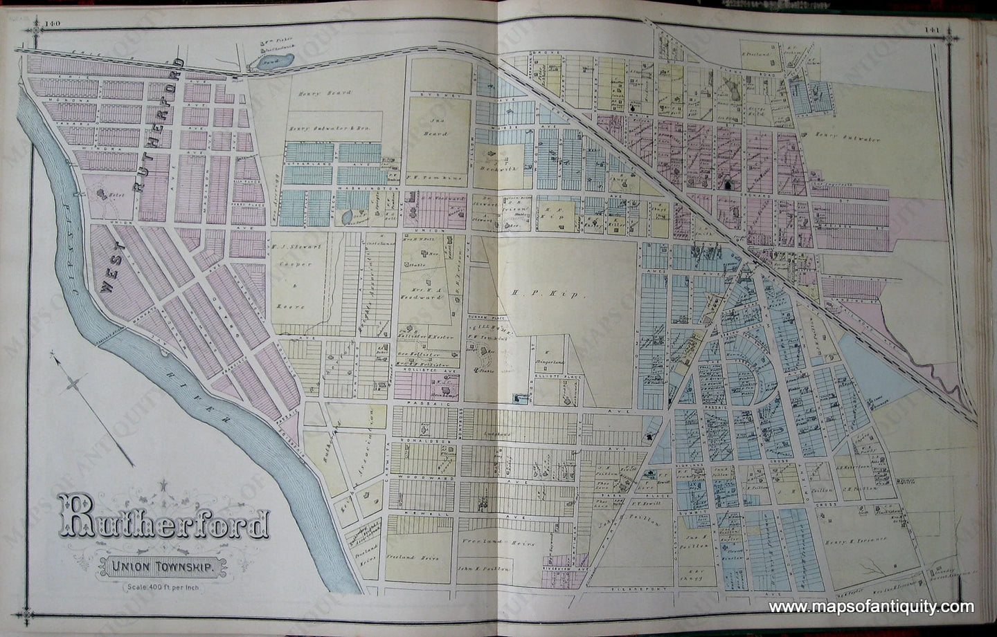 From the Atlas of Bergen Co. New Jersey, 1876, by Walker and Pease. Double page map of Rutherford, Union Township, with engravings of Terhune, Paulison and Romain residences on reverse side. Very good overall antique condition. Approximately 16 x 26 inches.