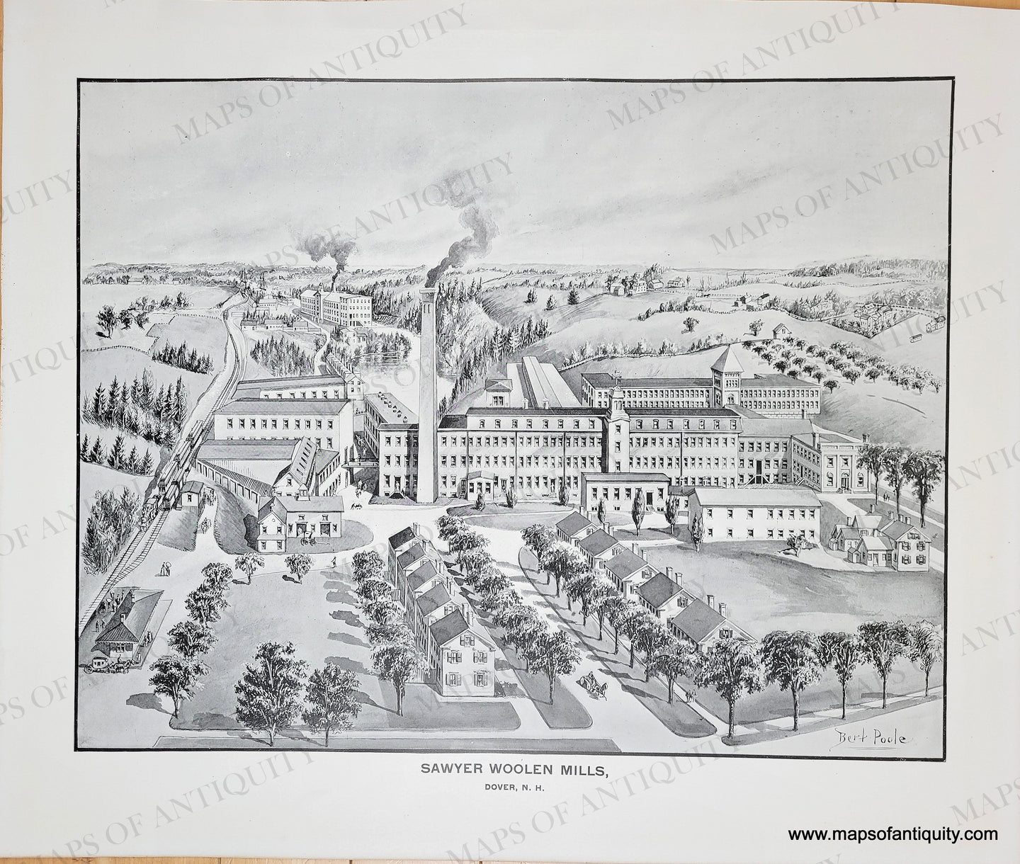 Antique black and white illustration of the Sawyer Woolen Mills in Dover, New Hampshire, from the Town and City Atlas of the State of New Hampshire, by D.H. Hurd, 1892. Artist Albert Poole. Very good overall antique condition with some mild foxing mainly outside the neatline, and some minor edge wear in some spots. Measures approx. 13 x 17.25 inches.