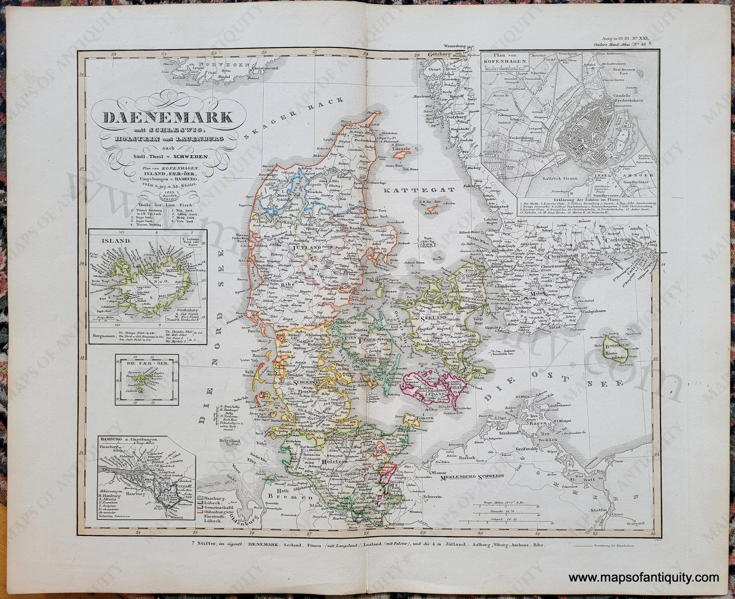 Antique hand colored map of Denmark and adjacent areas, with insets of Iceland, City Plan of Copenhagen, Faeroe Islands, and Hamburg, from Stieler's Hand-Atlas uber alle theile der Erde nach dem neuesten Zustande und uber das Weltgebaude, published by Justus Perthes. Very good overall antique condition, approx. 12 x 14.25 inches to the neatline.