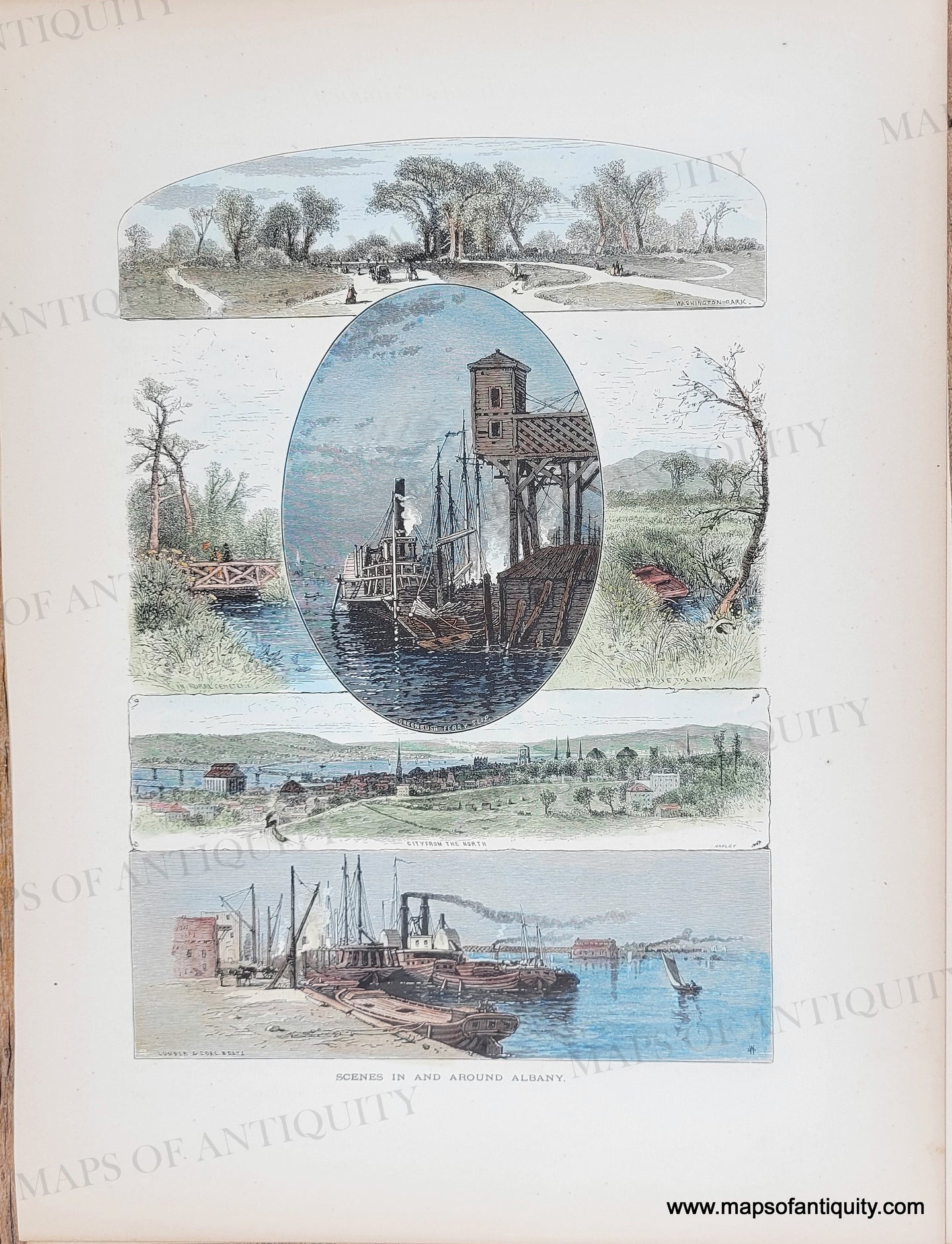 Antique engraving of views of the environs of Albany, New York, from William Cullen Bryant's classic 1872 work, "Picturesque America." Images include "Washington Park," "Greenbush Ferry Slip," "City from the North," and "Lumber and Coal Boats." The reverse side has a black and white engraving titled "Albany, from Kenwood" This piece measures 9.5 x 6.5 inches and is in Very good overall antique condition. Note: any "rainbows" or strange patterns in the image are called moire pattern- caused by taking a digital photo or scan of the many parallel lines in the print- these are not in the print and we can try to take more photos if you are concerned.