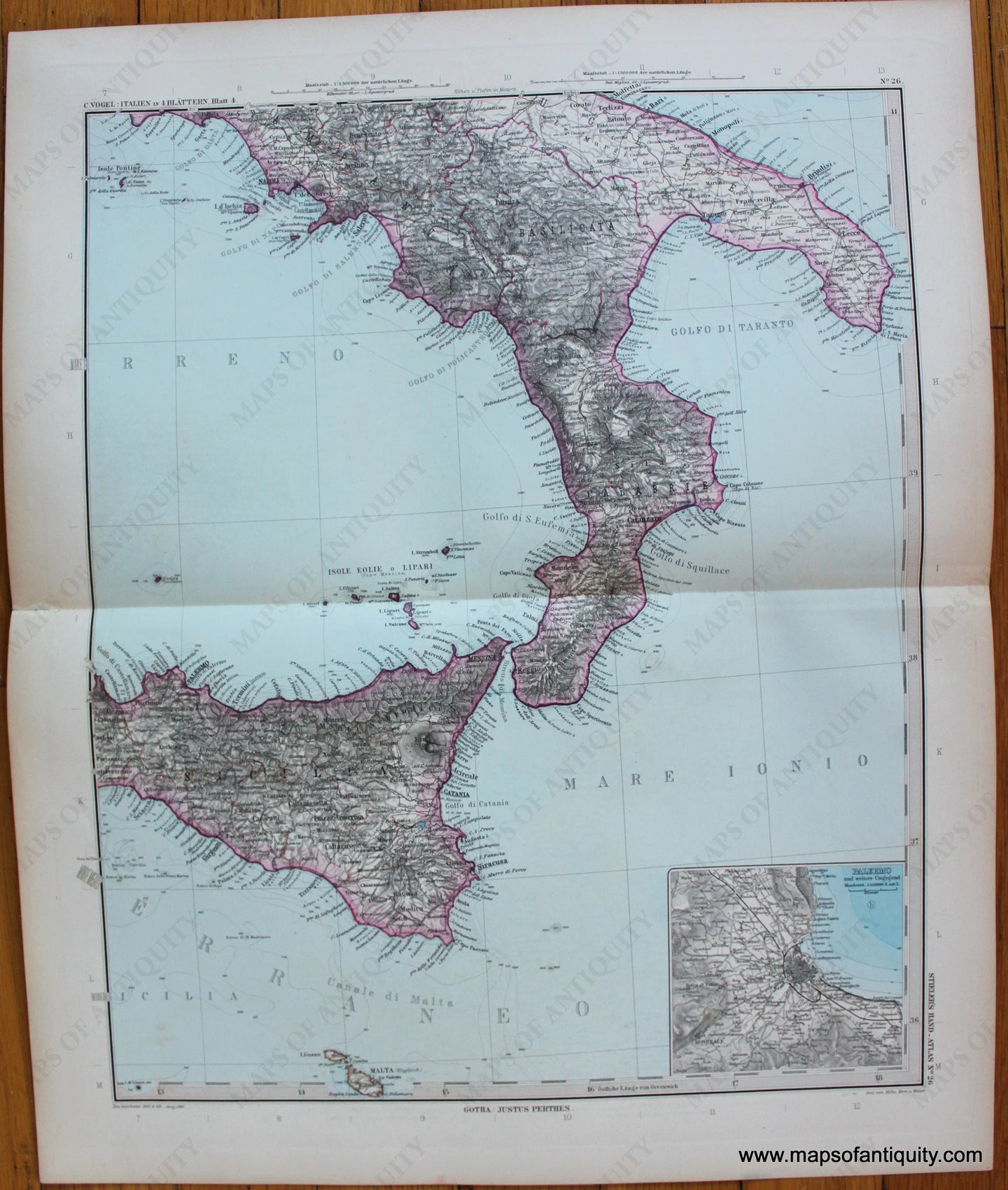 Antique map of part of Italy from Stieler's Hand-Atlas, c. 1889. Includes most of Sicily with the south of Italy including Naples and Bari. Inset of Palermo. Shows cities and towns, railroads, as well as political divisions at that time. Text in German. Very good overall antique condition with very mild foxing and toning at paper edges. Small tears at paper edges. Paper is fragile. Measures approx. 13 x 16 inches to the neatlines.