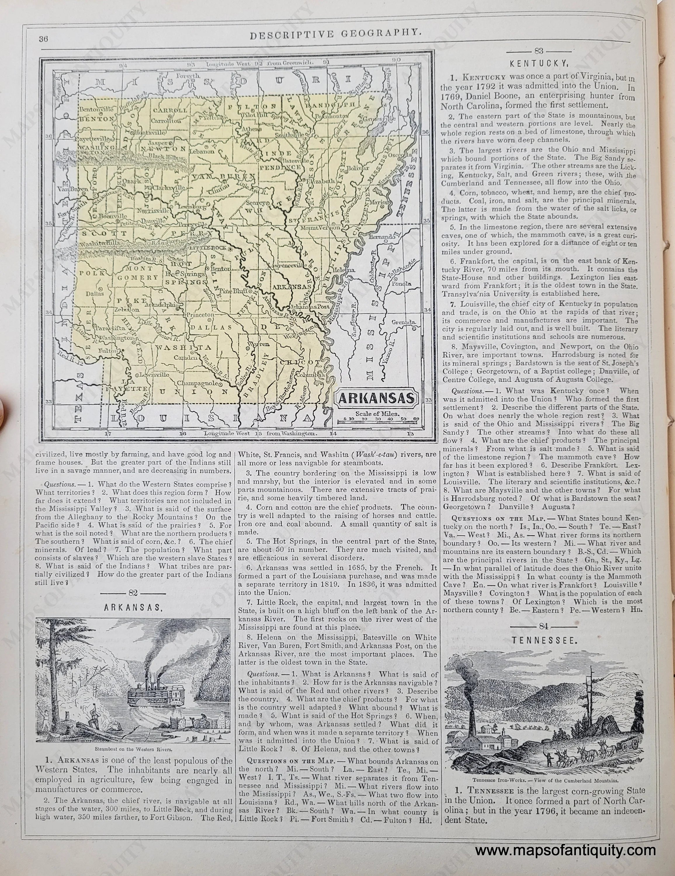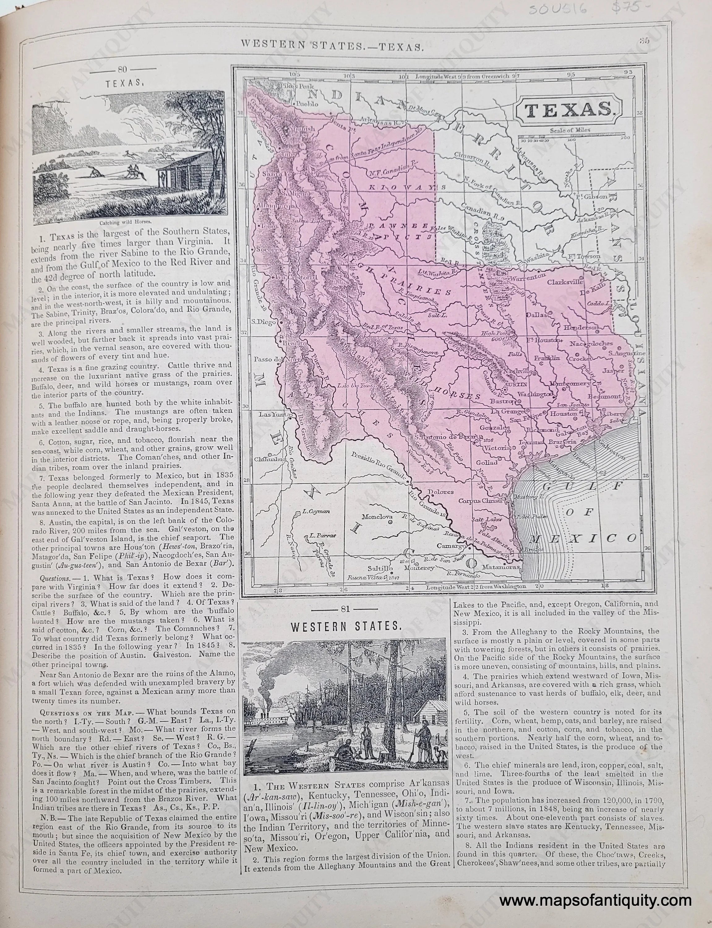Antique map from Mitchell's Intermediate Geography, by Augustus Mitchell and published by Thomas, Cowperthwait & Co. in 1850. Shows cities, counties, railroads, and some topography. On a page with additional text. Very good antique condition with some tiny spots.TX map measures approx. 7 x 5.25 inches to the neatline. AR map measures approx. 5.25 x 5.25 inches to the neatline. Total page size is 12.25 x 9.25 inches.