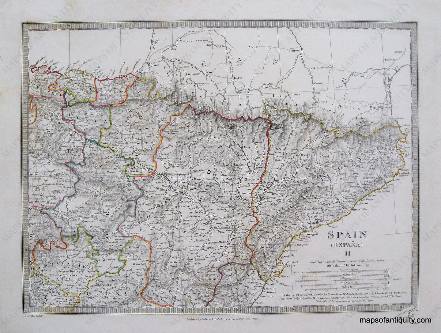 Antique engraved map of North Eastern Spain published under the Superintendence of the Society for the Diffusion of Useful Knowledge. Fine detail of townships, towns, roads and routes, landforms and water bodies. Hand colored, very good condition, may have antique hand written notations, approx. 11 1/2"h x 13 1/2"w.