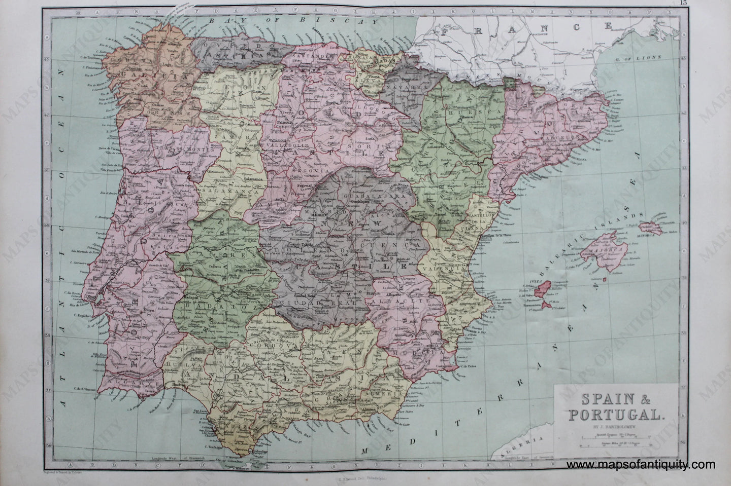 Antique printed color map of Spain and Portugal. Good condition with some creasing and a couple very small tears at the edges. By J. Bartholomew, in A Descriptive Hand Atlas of The World, 1873. Approximately 11.25" x 16" to the neatline.