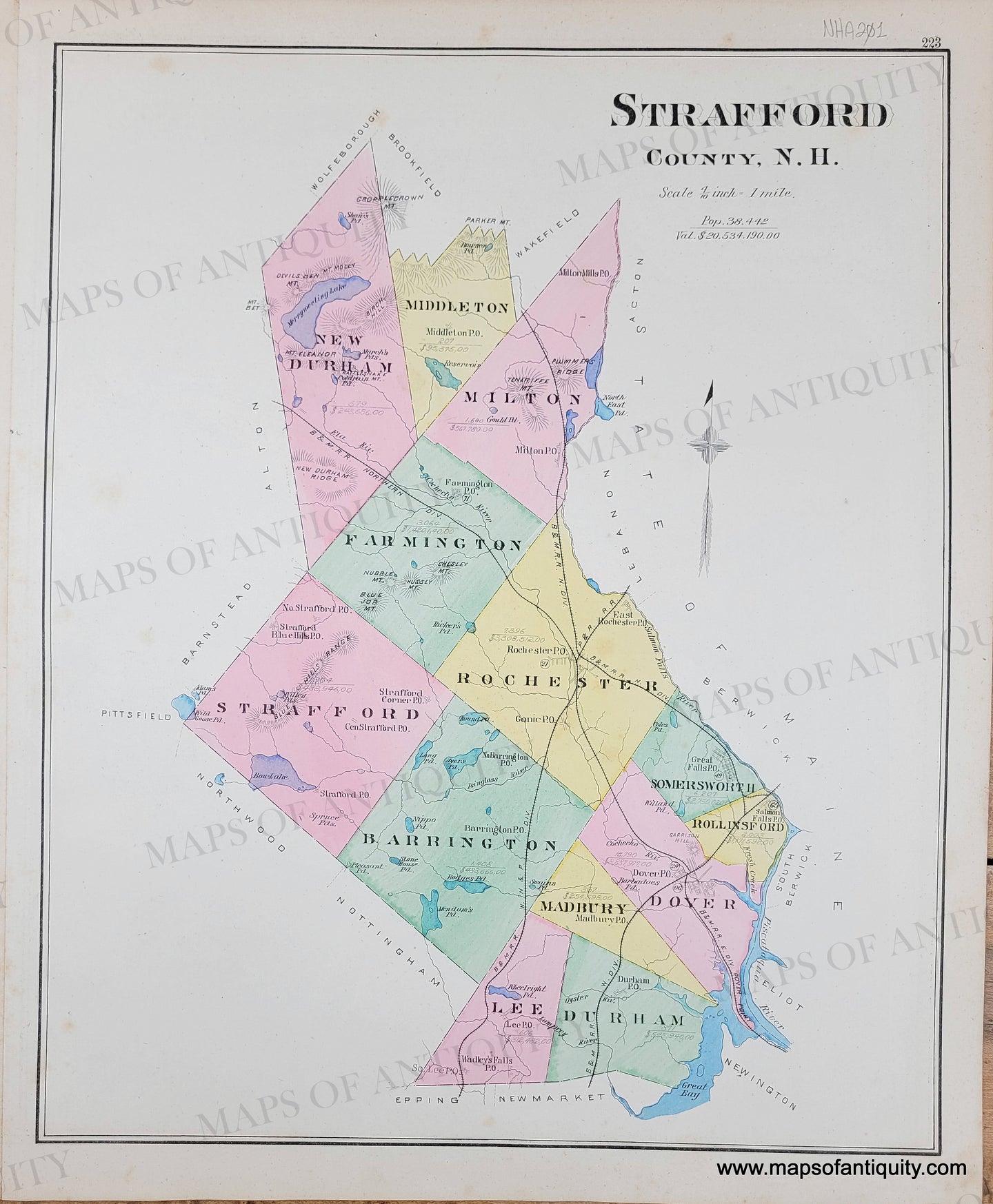 Antique hand-colored map of Strafford County, New Hampshire. From the Town and City Atlas of the State of New Hampshire, by D.H. Hurd, 1892. Original hand-coloring by town, with topographical detail, and locations of railroads and post offices at time of publication. Very good antique condition with mild toning of the paper and a few areas of minor foxing/soiling. Measures approx. 13 x 17.25 inches.