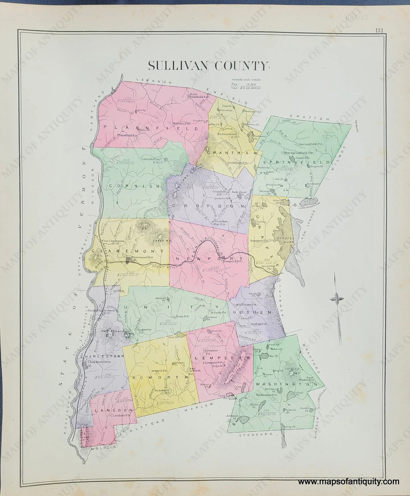 From the Town and City Atlas of the State of New Hampshire, by D.H. Hurd, 1892. Good condition, with minor foxing. Hand-colored, shows property owners' names, approx. 13 x 17.25 inches.