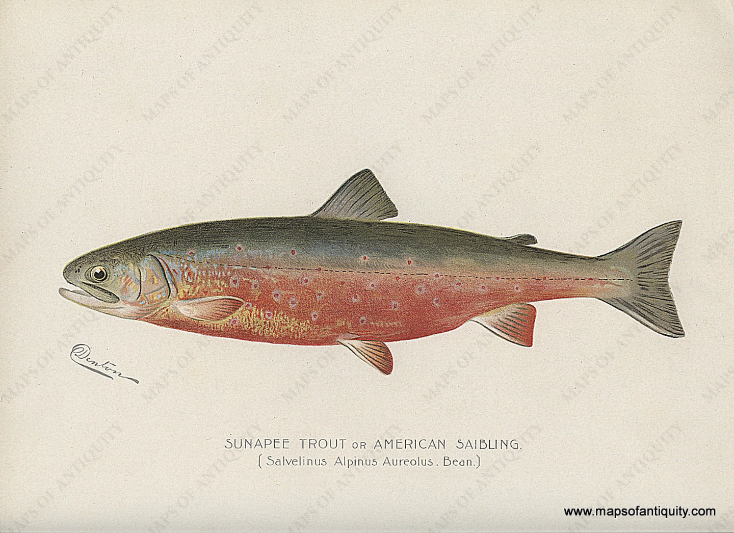 Original antique chromolithograph by Denton, part of a series documenting various species of fish for the State of New York Fisheries, Game, and Forest Commission's Annual Reports, late 1890's to early 1900's, in very good condition, approx. 9.25 x12 inches. (Please note date of piece is circa 1900 to 1906).*****SOLD*****