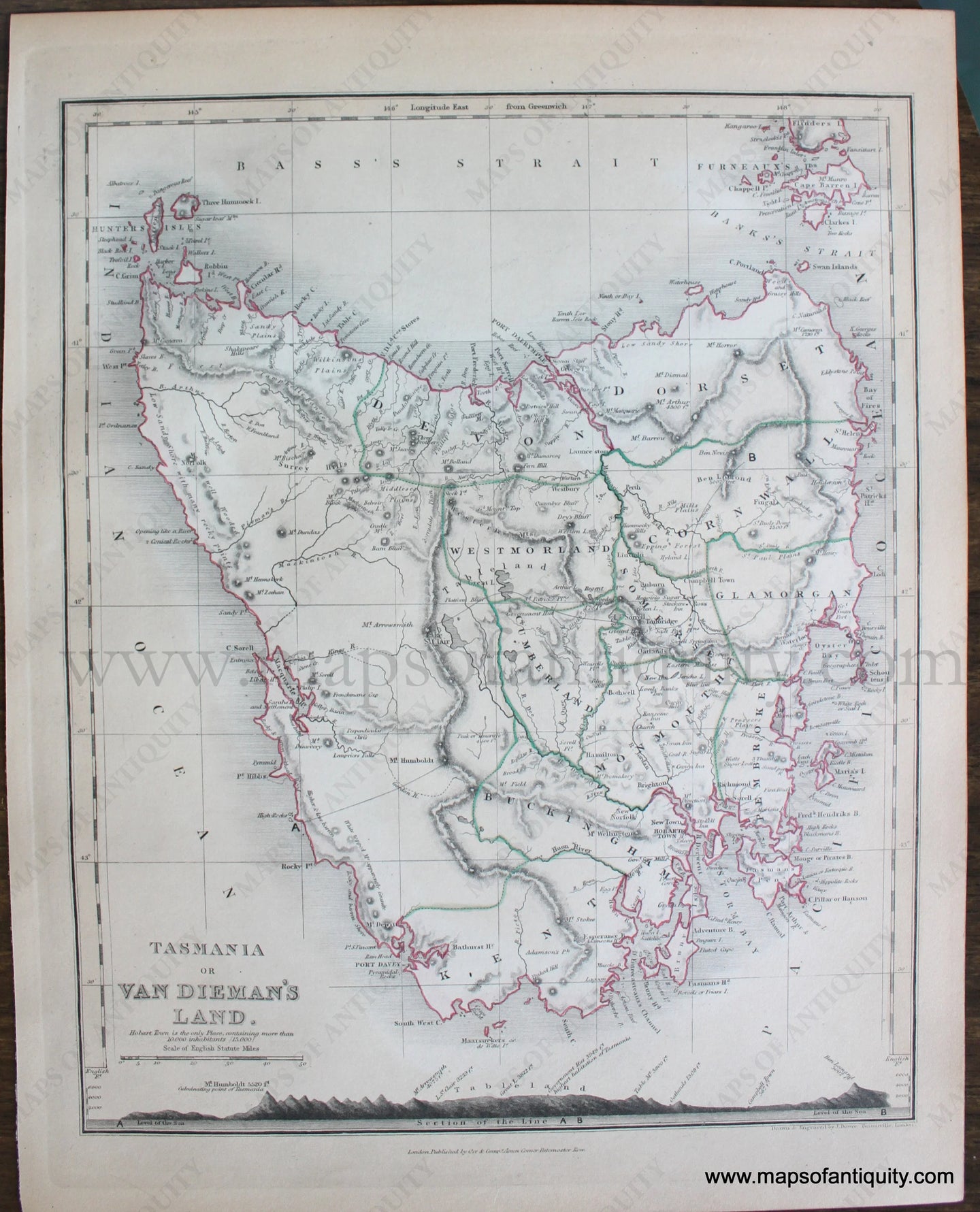 Antique hand colored map of Tasmania. Engraved by J Dower. From A Descriptive Atlas of Astronomy and of Physical and Political Geography by the Rev. Thomas Milner, maps by Augustus Petermann, and published by William S. Orr & Co, 1850. Sections at bottom show topography. Very good condition with some minor signs of age, such as spots, toning, and mild image transfer. Tight margin. Page measures approx. 9.25 x 12 inches.