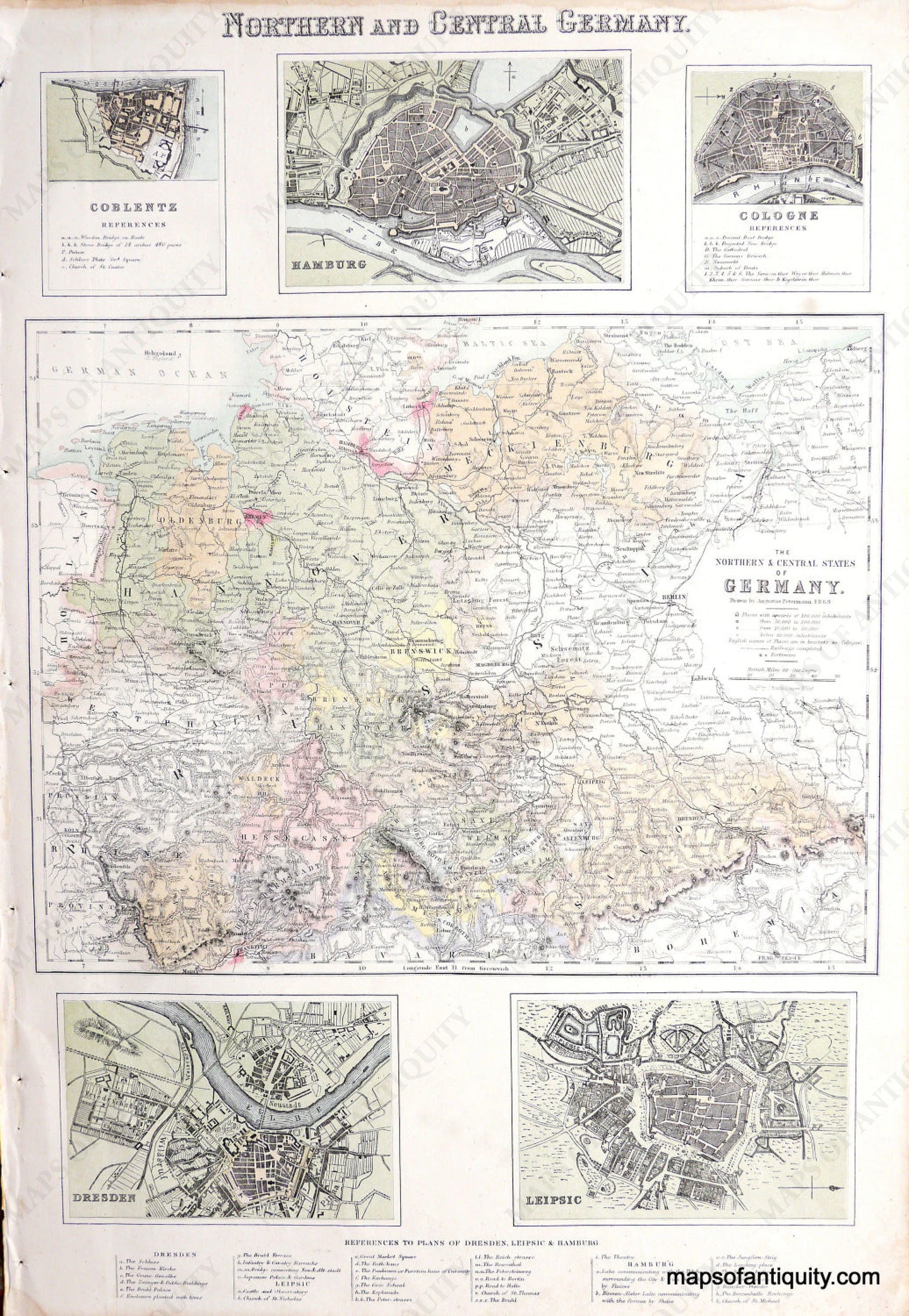 Antique hand colored map of northern and central Germany in the mid-19th century, with states, cities, towns, and topographical features; includes city plans of Coblentz (Koblenz), Hamburg, Cologne, Dresden and Leipsic (Leipzig). Very good condition, some soiling and toning along edges, top edge slightly bent, published by Fullarton & Co., London, Edinburgh and Dublin, 16 x 12 inches.