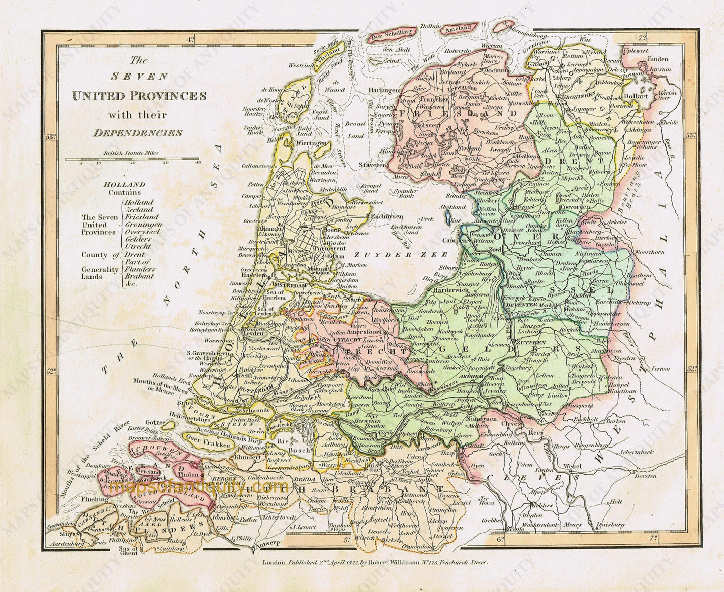 Antique hand colored map of Holland and the Netherlands from Wilkinson's General Atlas of the World published in 1827. This map was originally published in 1822, as indicated in the small print at the bottom of the map, and the plate was likely updated and reused for the 1827 publication. Good to very good antique condition with some very light surface dirt and possible spotting. approx. 8.75 x 11 inches.