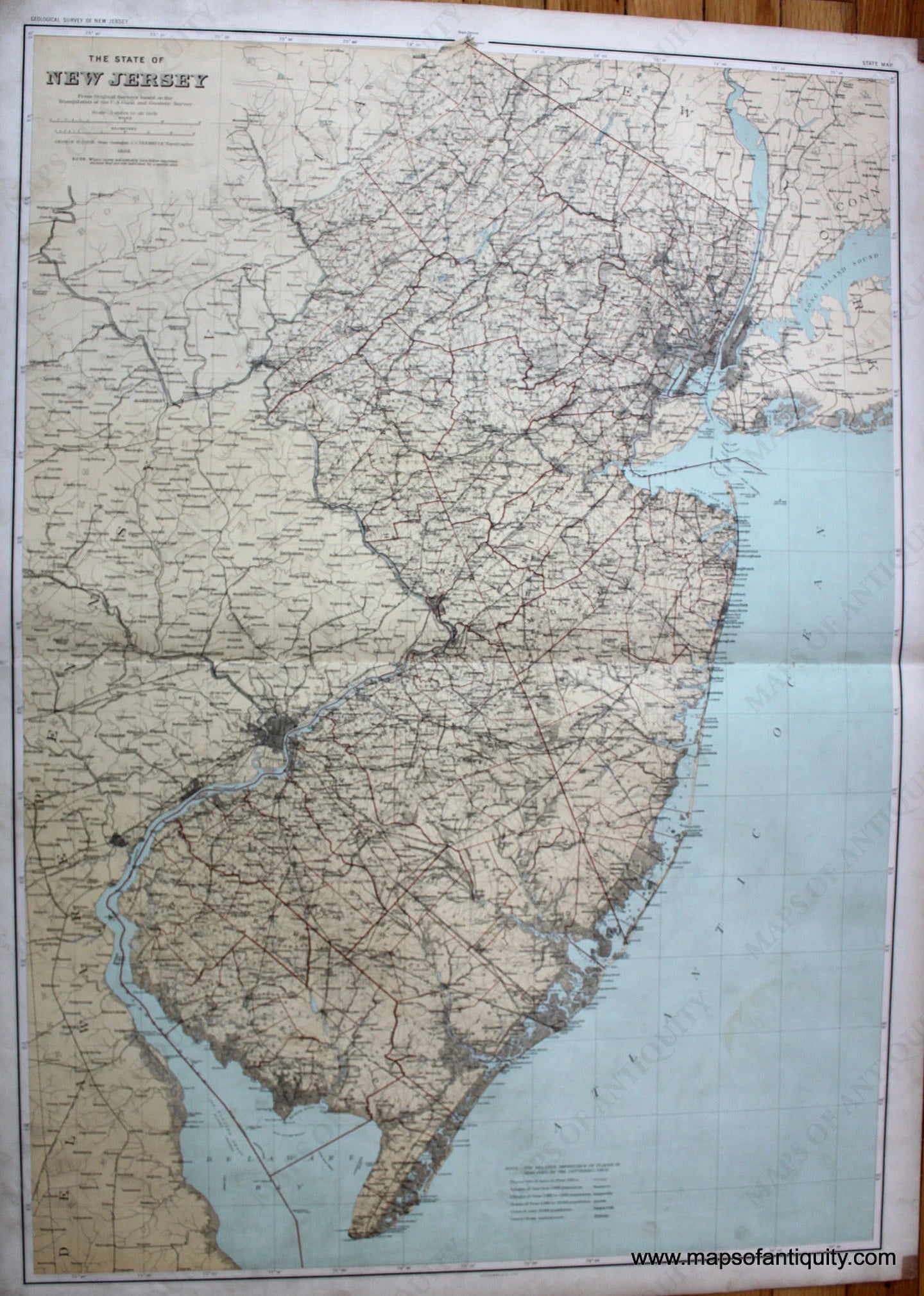 Antique printed color map, State Map showing the entire state of New Jersey. Included is a note: The relative importance of places is indicated by the lettering. Good condition, 24.75 x 35" (extends slightly outside of top border) Some surface soiling