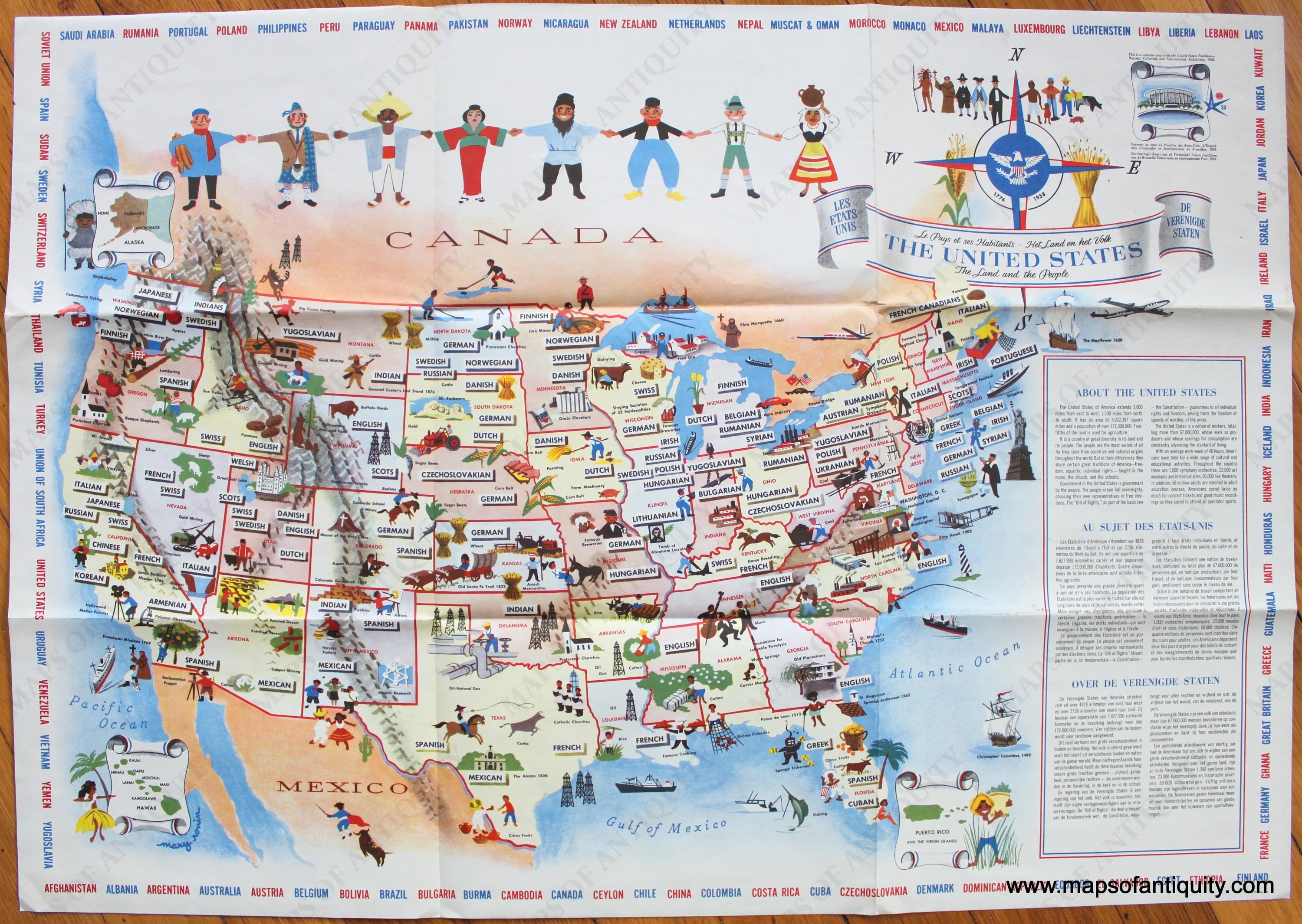 Printed color antique map of the United States featuring information about the varied backgrounds of the citizens and the industries paracticed in different parts of the country. Made for the US Pavillion at the Brussels World's Fair, Expo 58. Bright graphic style. Puerto Rico, Hawaii, and Alaska are shown as territories. This map was issued as a folded map and it retains its folds. Good to very good antique condition with some minor wear along the folds and some small spots. Approx. 18 x 26 inches.