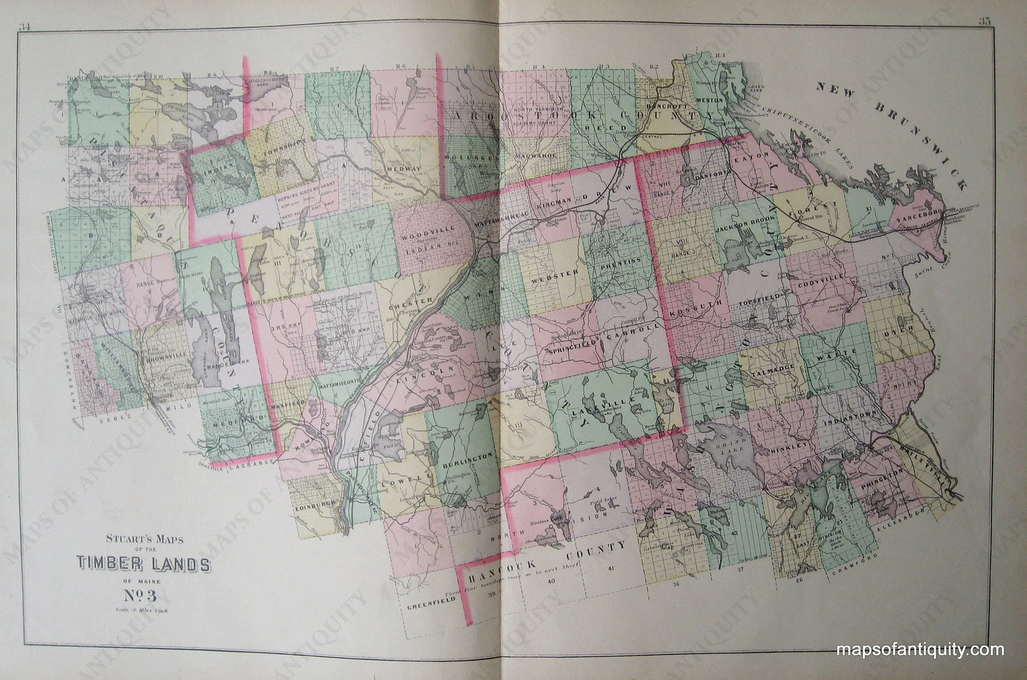 Hand-colored antique map of Maine's timber lands in the late 19th century, including Penobscot, Aroostook and Washington counties, traversed by the Penobscot River, with named townships and numbered timber company woodlots, public lands, very good condition, 15 x 12.5 inches.