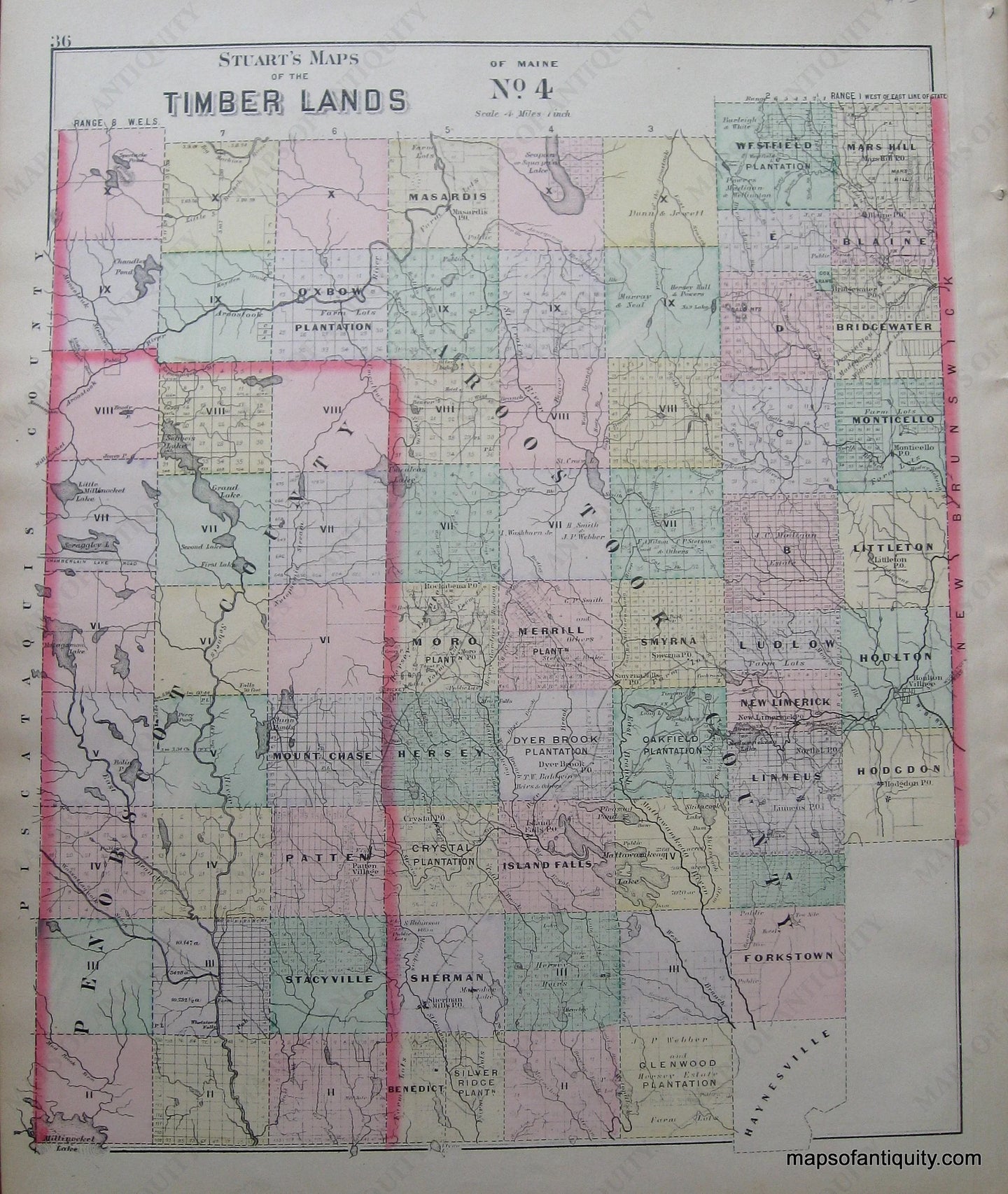 Hand-colored antique map of Maine's timber lands in the late 19th century, including northeastern Penobscot and Aroostook counties, with named townships and some townships or quadrants identified only by an upper case letter or Roman numeral, along with numbered timber company woodlots, public lands, very good condition, 15 x 12.5 inches.