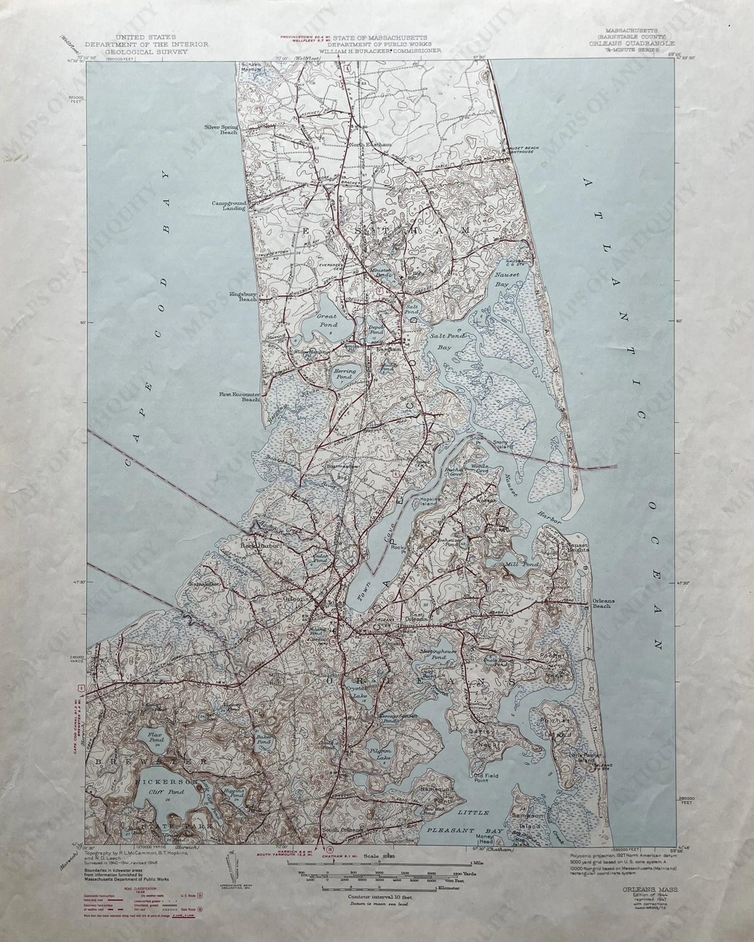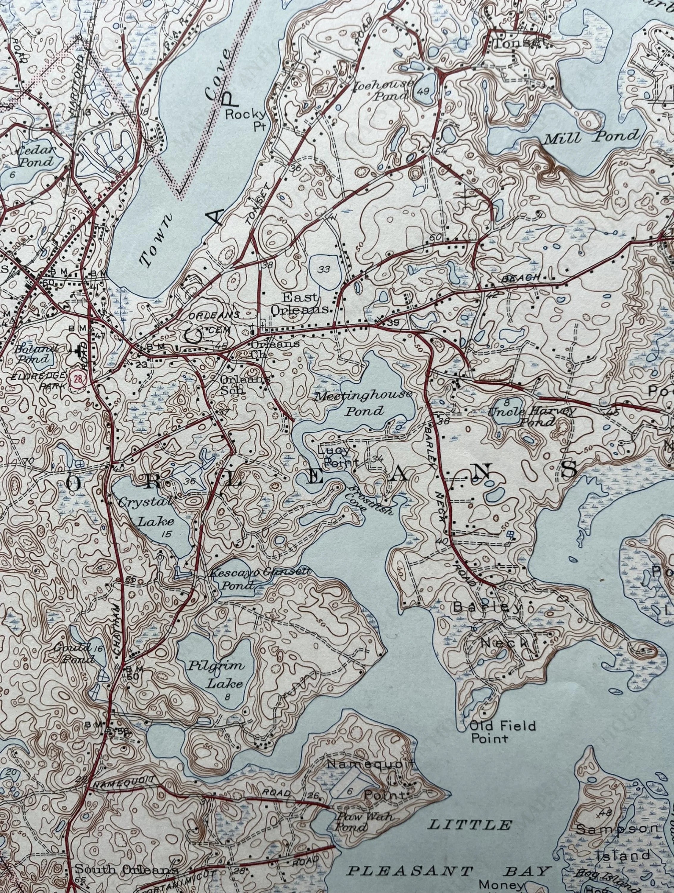 Antique topographic map of Orleans, Mass., on Cape Cod, includes Eastham, and parts of Nickerson State Park. This map is in good to very good antique condition with some edge wear. The sheet measures approximately 21" h x 17"w. Printed in 1947 of a 1944 map.