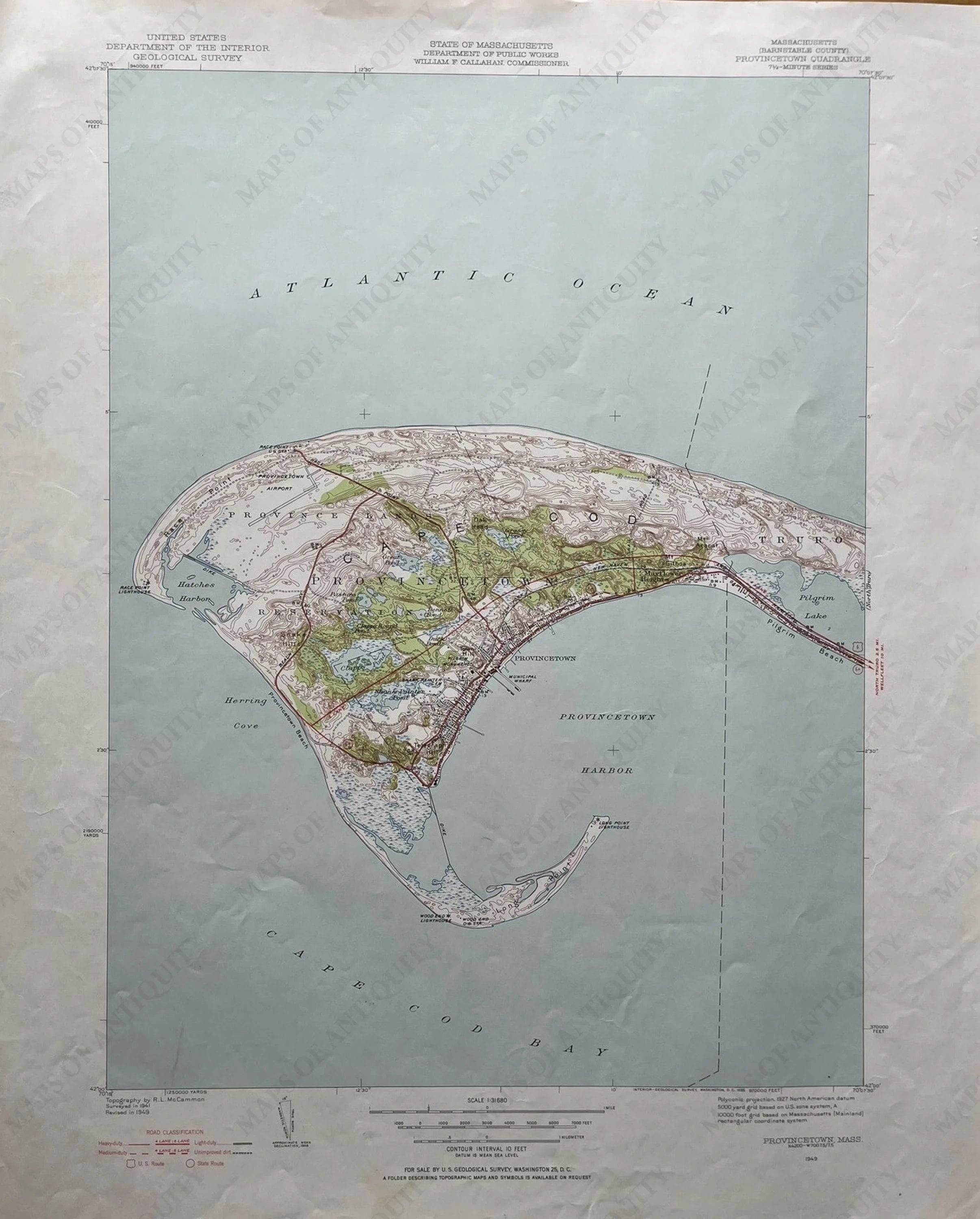 Antique topographic map of Provincetown, Mass., on Cape Cod, includes the Province Lands, Race Point, Long Point, Pilgrim Beach and Pilgrim Lake. This map is in good to very good antique condition with some edge wear. The sheet measures approximately 21" h x 17"w. Printed in 1949 map.