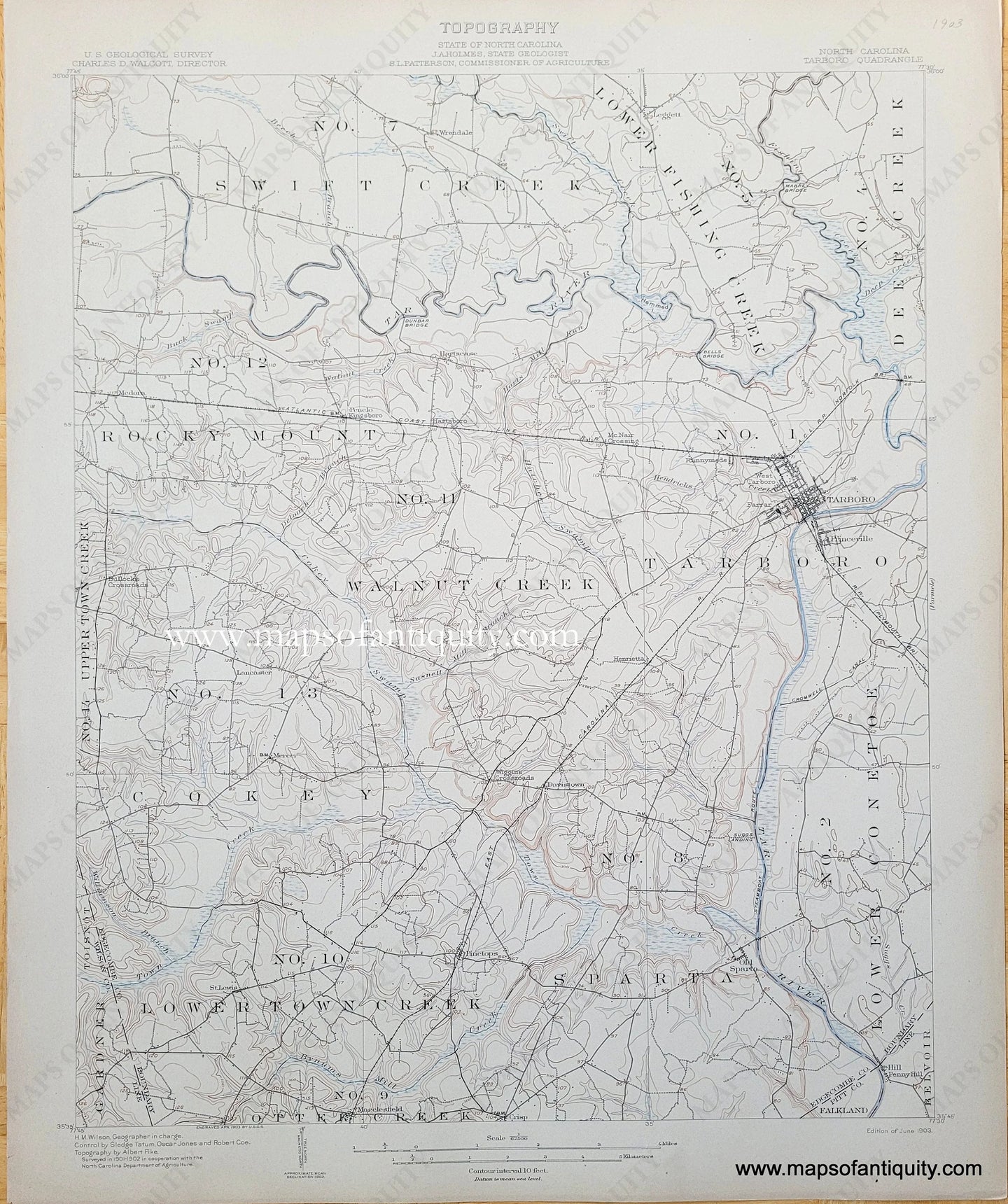 Antique topographic map of the Tarboro, NC area with Pinetops and Leggett. Includes towns, topography, named mountains and hills, and railroad lines. Good antique condition with minor signs of age. Sheet size is approx. 20"h x 16"w.