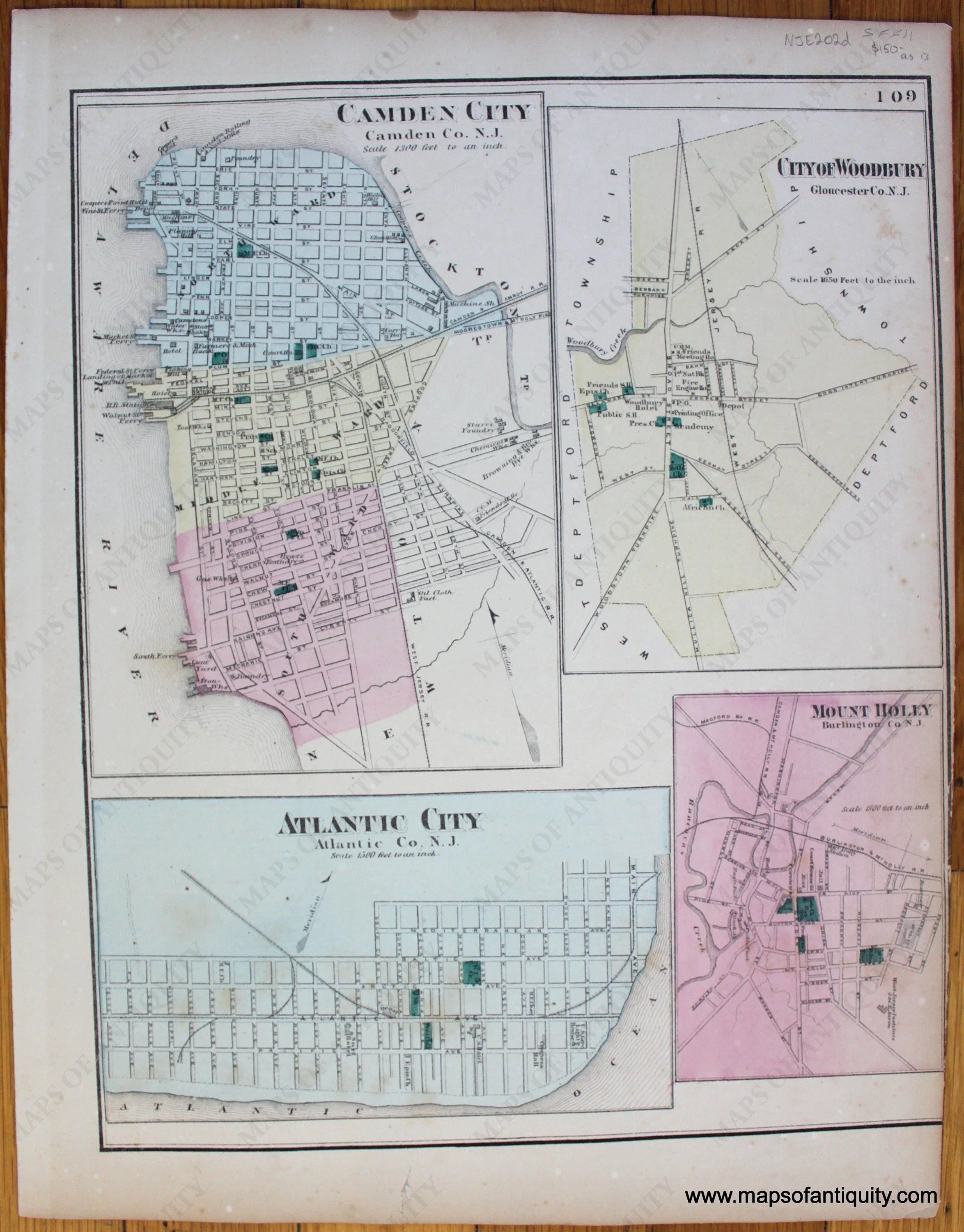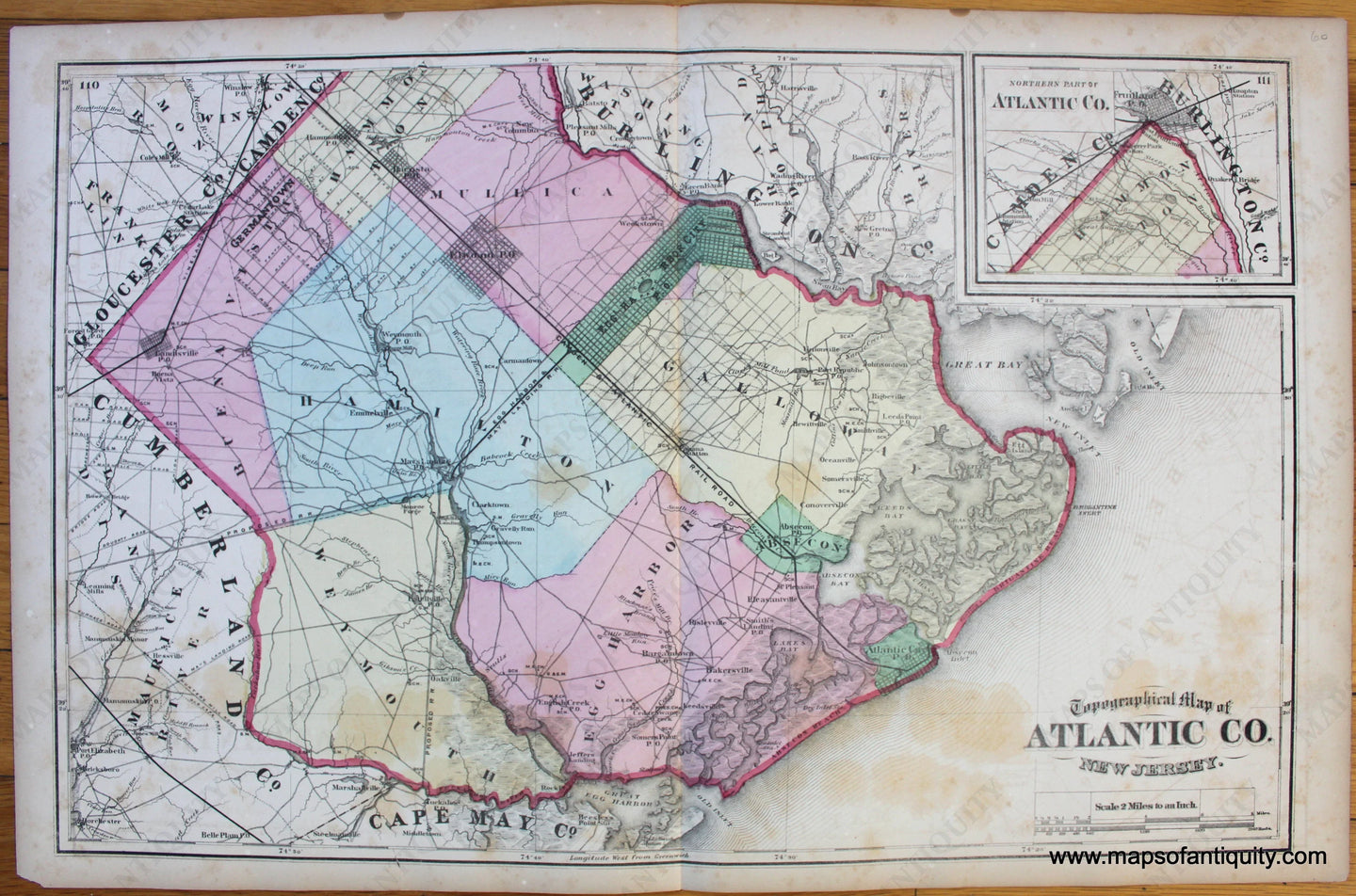 Hand colored Map of Atlantic County, New Jersey, from the State Atlas of New Jersey by F.W. Beers published in 1872. Showing roads, rivers, and landmarks, with inset of Northern Part of Atlantic County showing roads, and map of Camden City, City of Woodbury, Atlantic City, and Mount Holly showing roads on reverse side, fair condition with obvious signs of age. Measures approx. 14 1/2"h x 22"w. Priced as is.