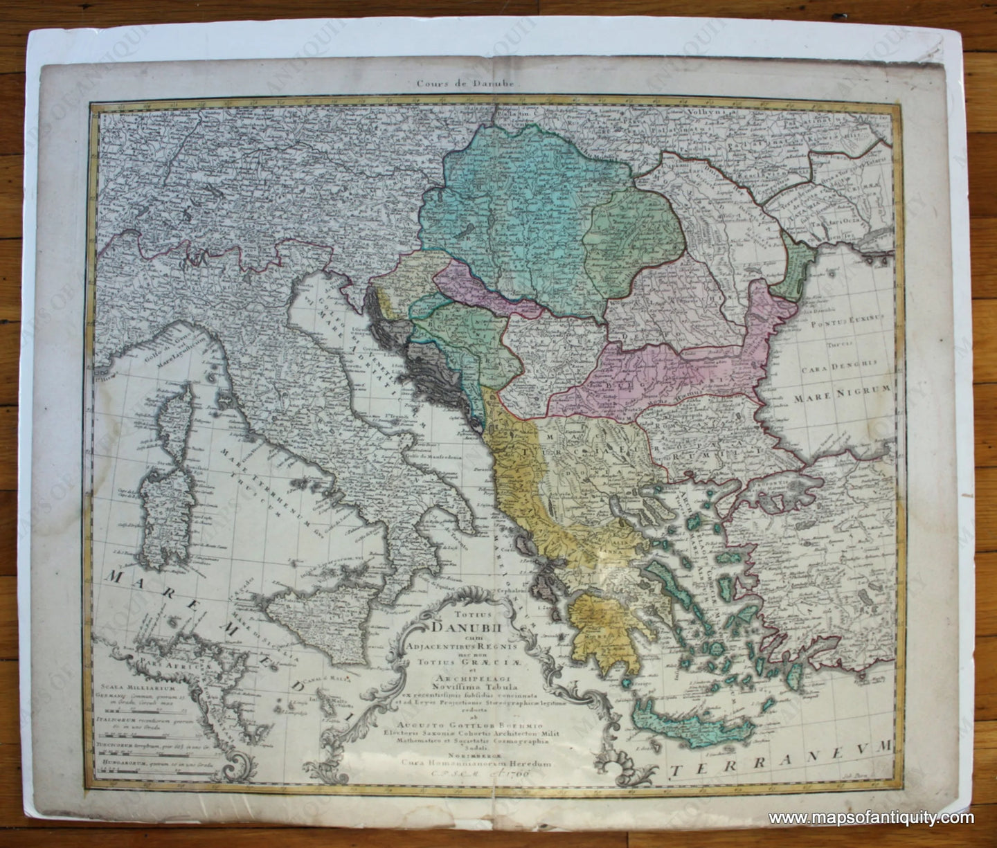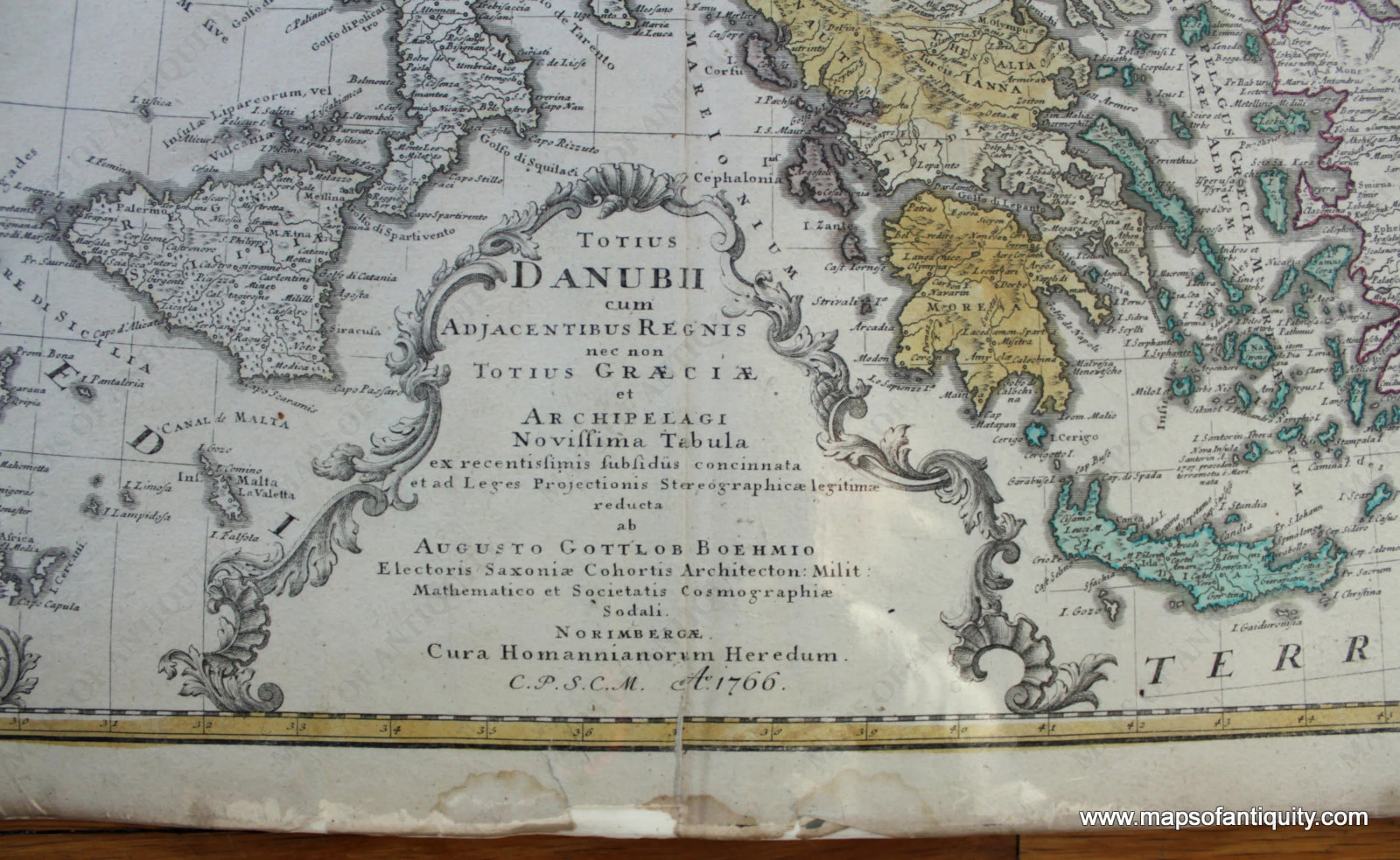 Antique hand colored map showing portions of present-day Croatia, Bosnia, Herzegovina, Serbia, Montenegro, Albania, Greece, etc. By Homann, 1766. Good condition with heavy overall toning, spots of water damage (mostly at outer edges), and some roughing and soiling of the outer edges. Measures approximately 18.25" x 21.75" to the neatline.